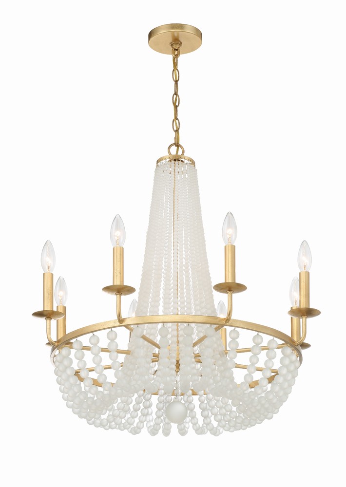 Add a touch of modern style to your décor with the Bella frosted glass bead chandelier. The metal frame features glass beads sweeping downward and inward, connecting a larger hanging glass ball. This elegant contrast of Matte Black or Antique Gold combined with frosted white glass adds a bold look to your indoor living areas.