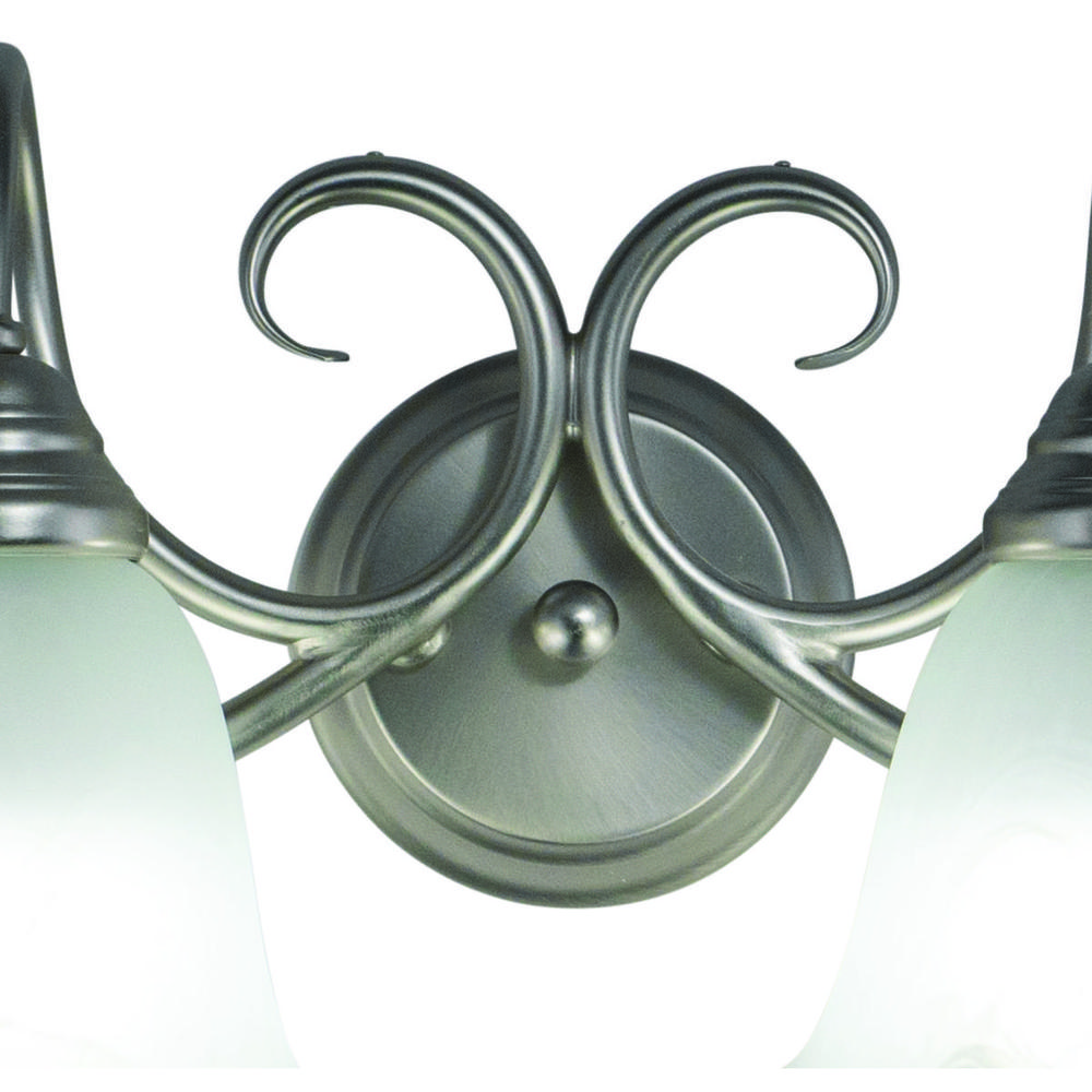 The Bella collection features a brushed nickel finish with white alabaster glass shades. The shades are delicately scalloped softening the overall feel. Elegantly scrolled arms complete the look of this transitional family of fixtures. This fixture may be mounted up or down. Choose from a variety of sizes for the perfect fit in your space.