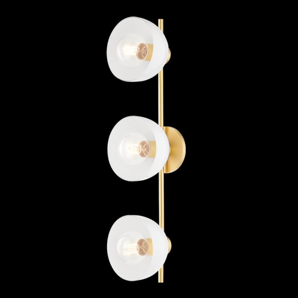 Cool contrast and fine form play well together in Belle's striking silhouette. The aged brass frame pops against the glossy white shades, featuring exposed bulbs for a futuristic effect. This 3-light bath sconce can be installed vertically or horizontally.