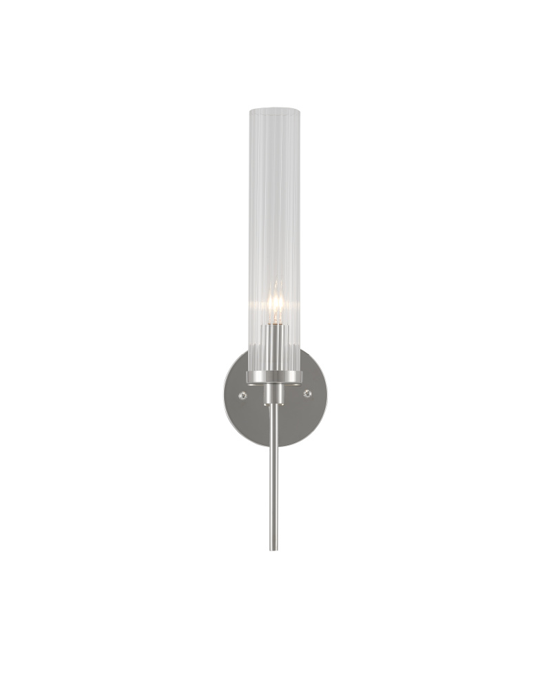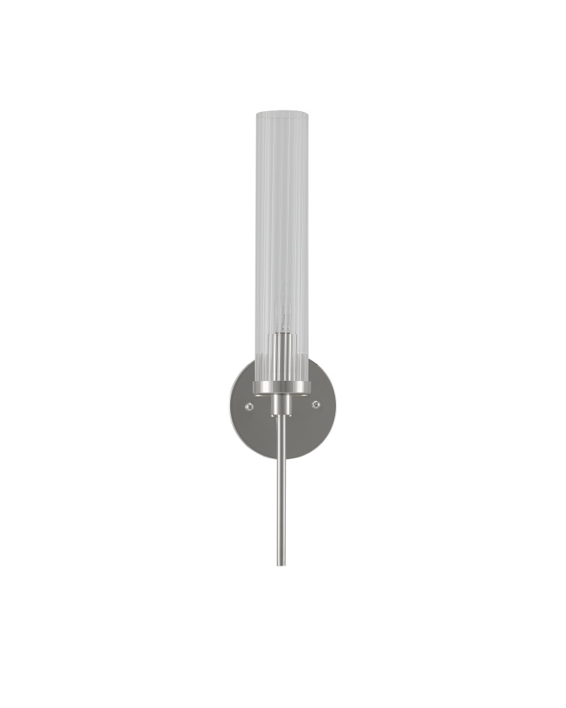 Slender in style, the Bellings Nickel Wall Sconce has a pencil thin body and tall striated glass canister shade. Made of metal in a polished nickel finish, the silver wall sconce is the very definition of simplicity but with a sophisticated complexity to its design. Part of the Bagno Collection of wall sconces designed for bathroom spaces.