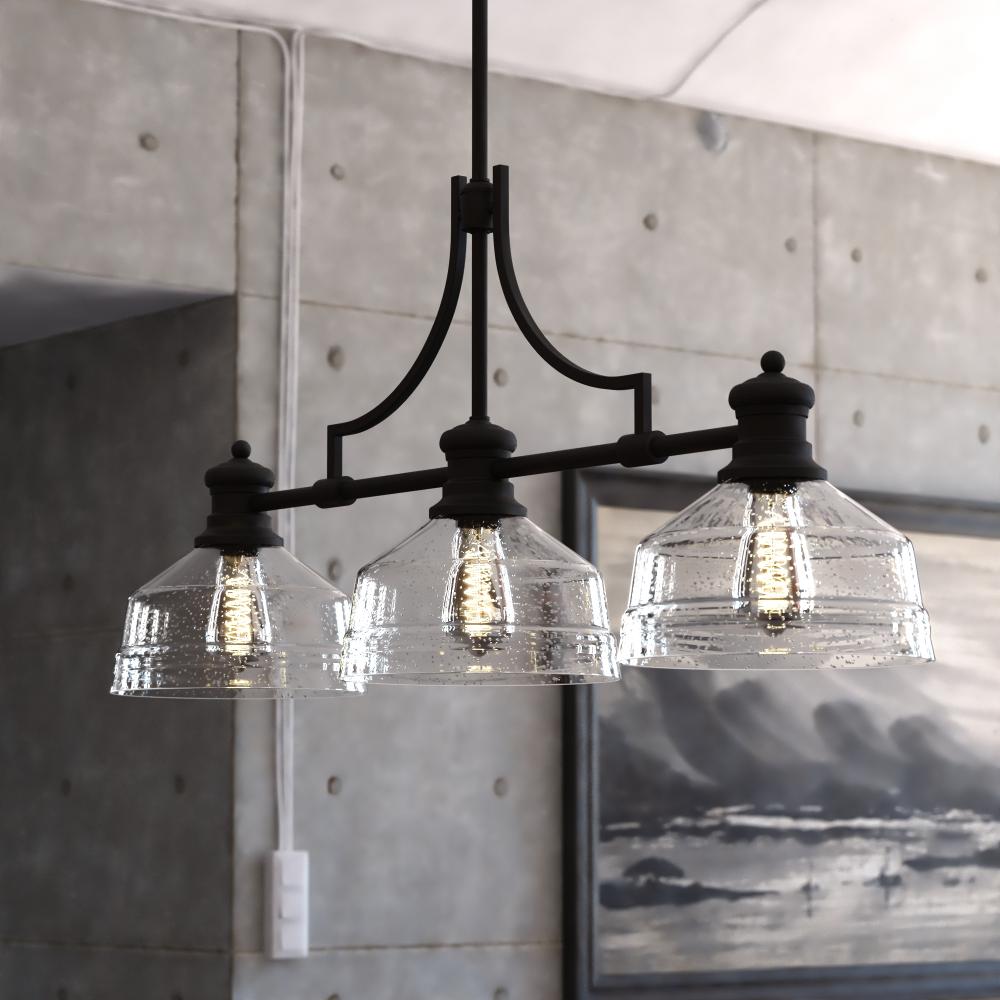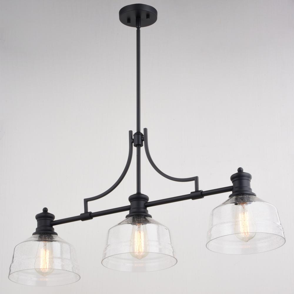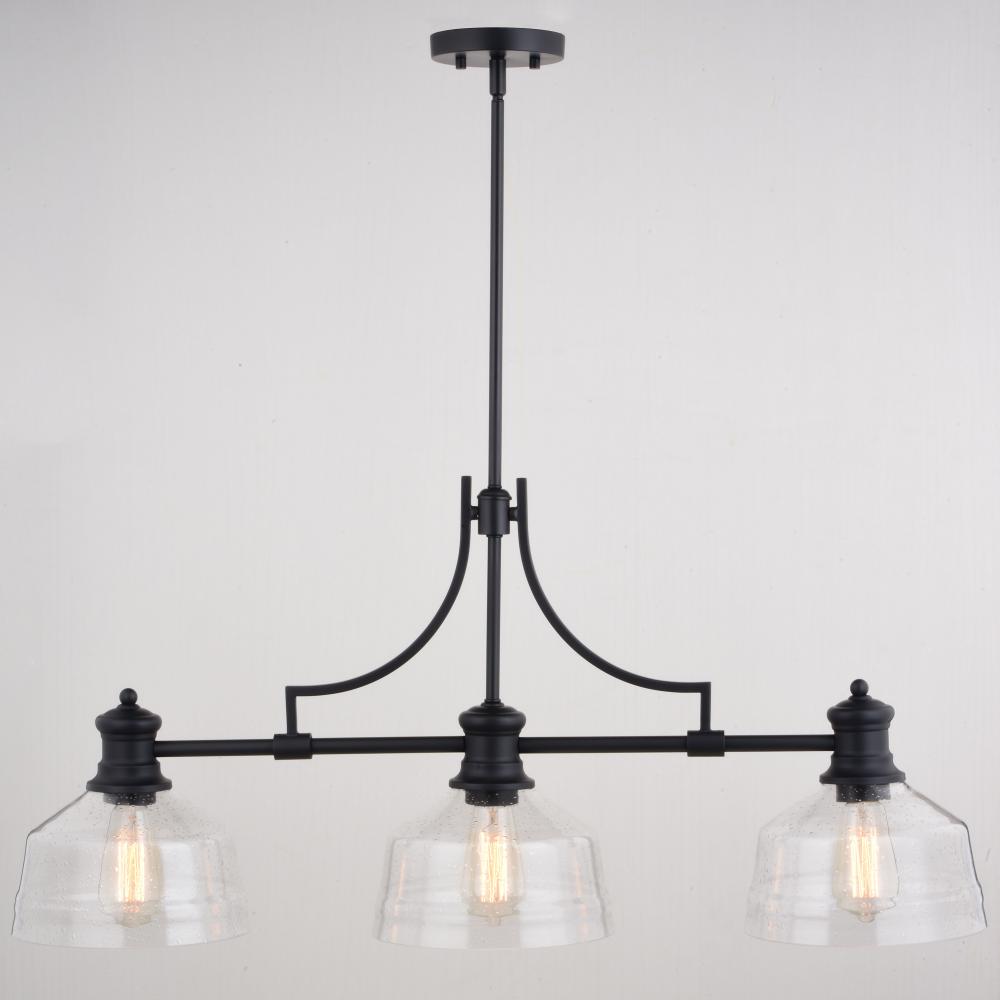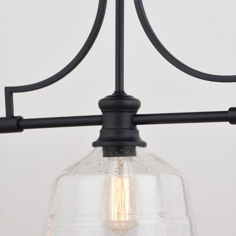 The Beloit island light is part of a welcoming farmhouse style collection that will add an inviting feel to your kitchen or living spaces. Soft curving lines finished in matte black, are paired with large clear seeded glass shades, creating a look that accents the most comfortable spaces. Combine it with vintage Edison style filament bulbs to complete the look and bring a level of sophistication to your trendy farmhouse or urban style. Ideal over kitchen islands and rectangular or oval dining room tables.