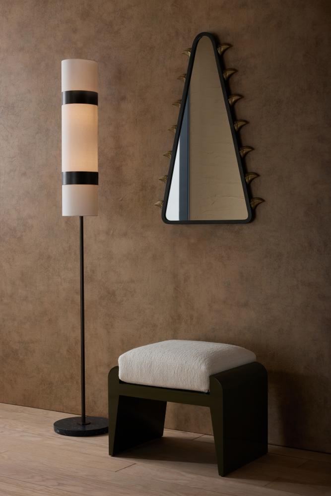 This essential piece offers a clean and contemporary update of a classic lantern shape. Anchored by a slender rod and chattered cuffs of English bronze, the unlined shade of white linen diffuses the light beautifully. Finished with a circular base of black marble and matching black cloth cord. Full-range dimmer.