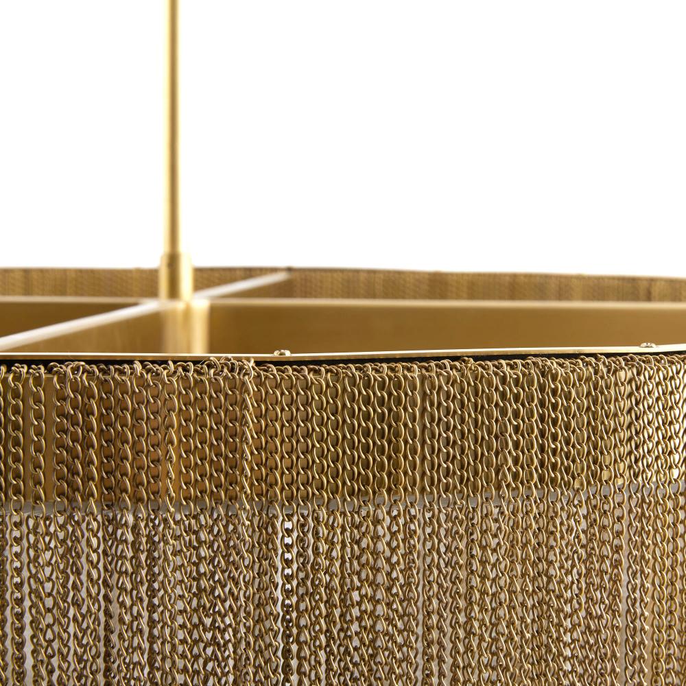 A waterfall of antique brass iron chains encircles an integrated LED ring on this contemporary chandelier. Its light-inspired feature plays with shadow and illumination to dramatic effect. Elegance personified; it will add a touch of drama to any space. Damp-rated, although limited covered outdoor conditions may affect finish.