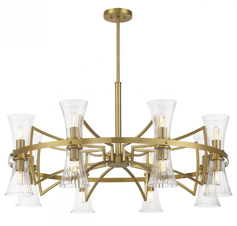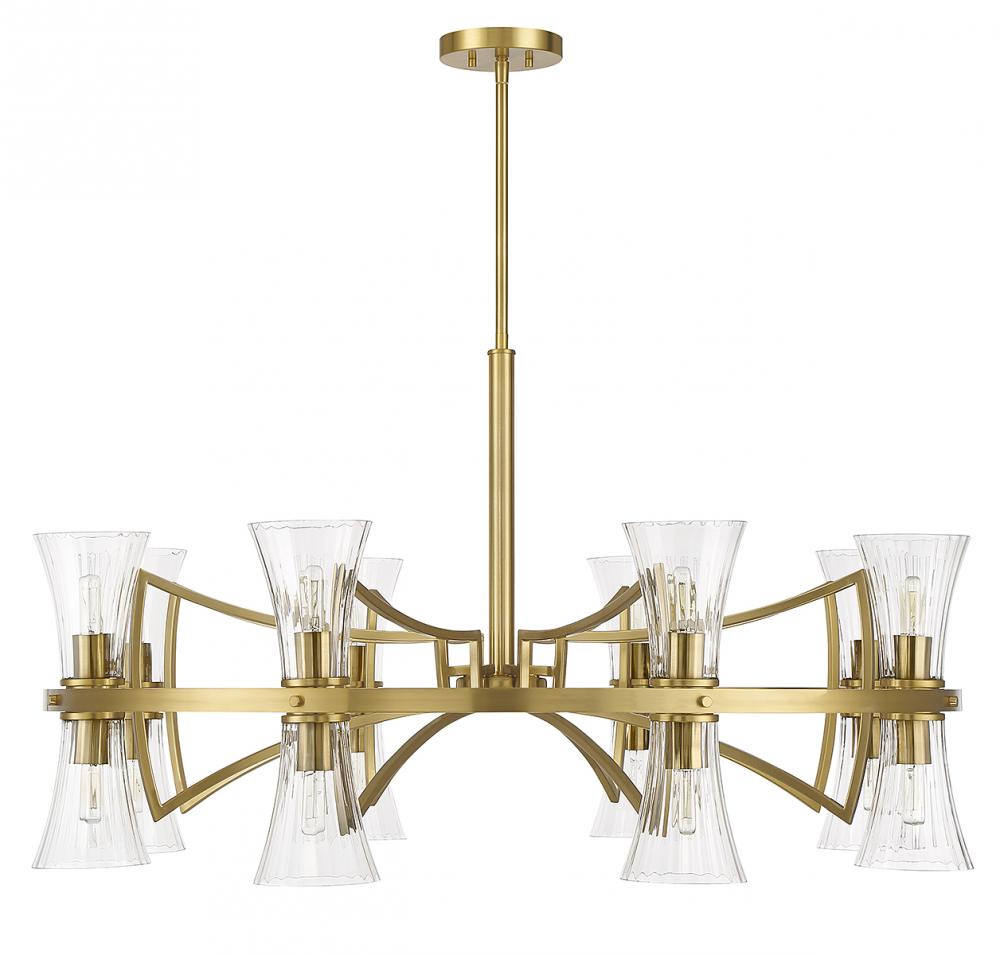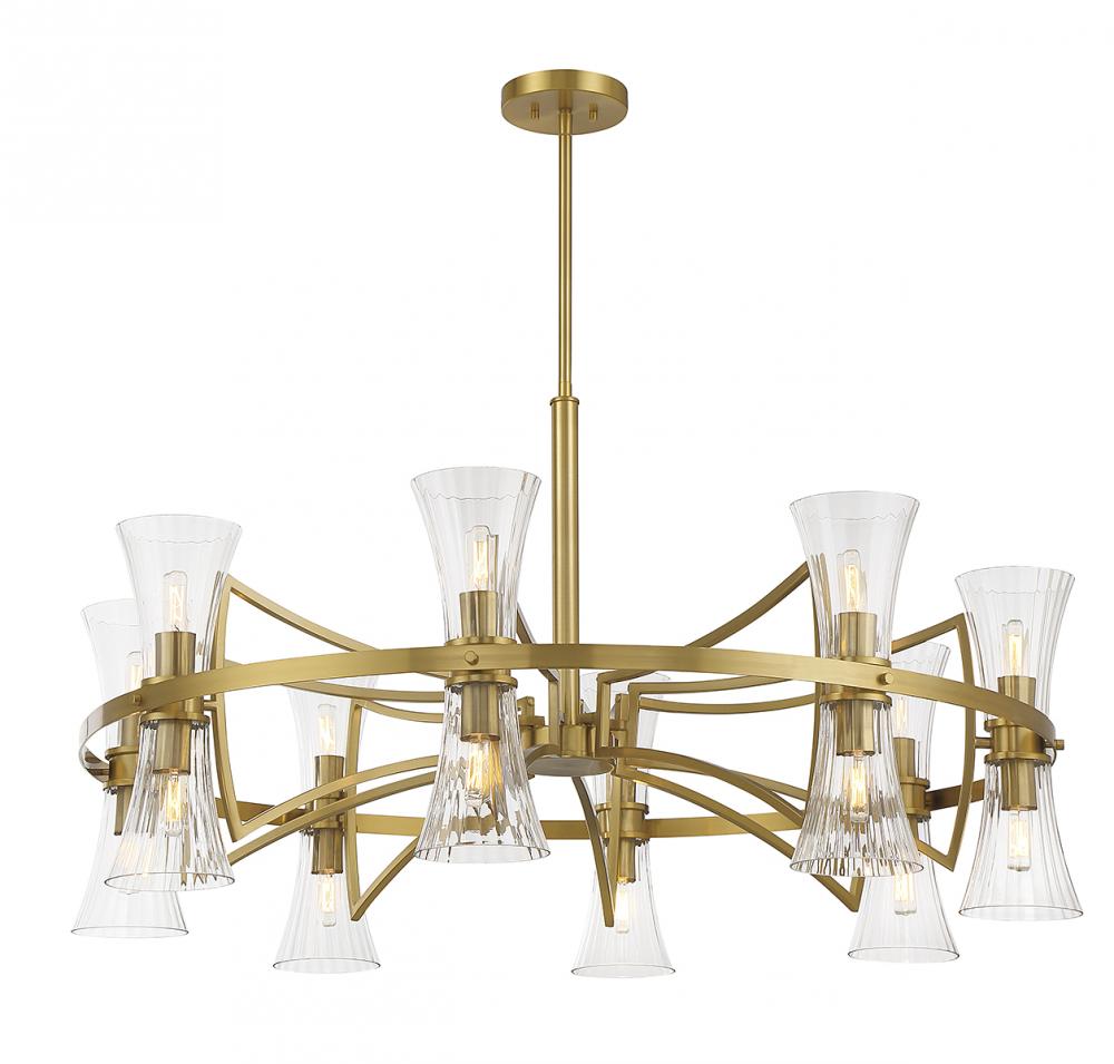 This Savoy House Bennington 16-light chandelier features pleasantly curving shapes that combine to create an intriguing lighting look. Fluted clear glass shades and thoughtful detailing on the structure, finished in warm brass, gives the impression of motion. Bennington is 45" in width and has an adjustable height ranging from 24.5" to 78". Comes with four 12" downrods and one 6" downrod. Uses 16 candelabra size bulbs of up to 60 watts per bulb (bulbs not included).