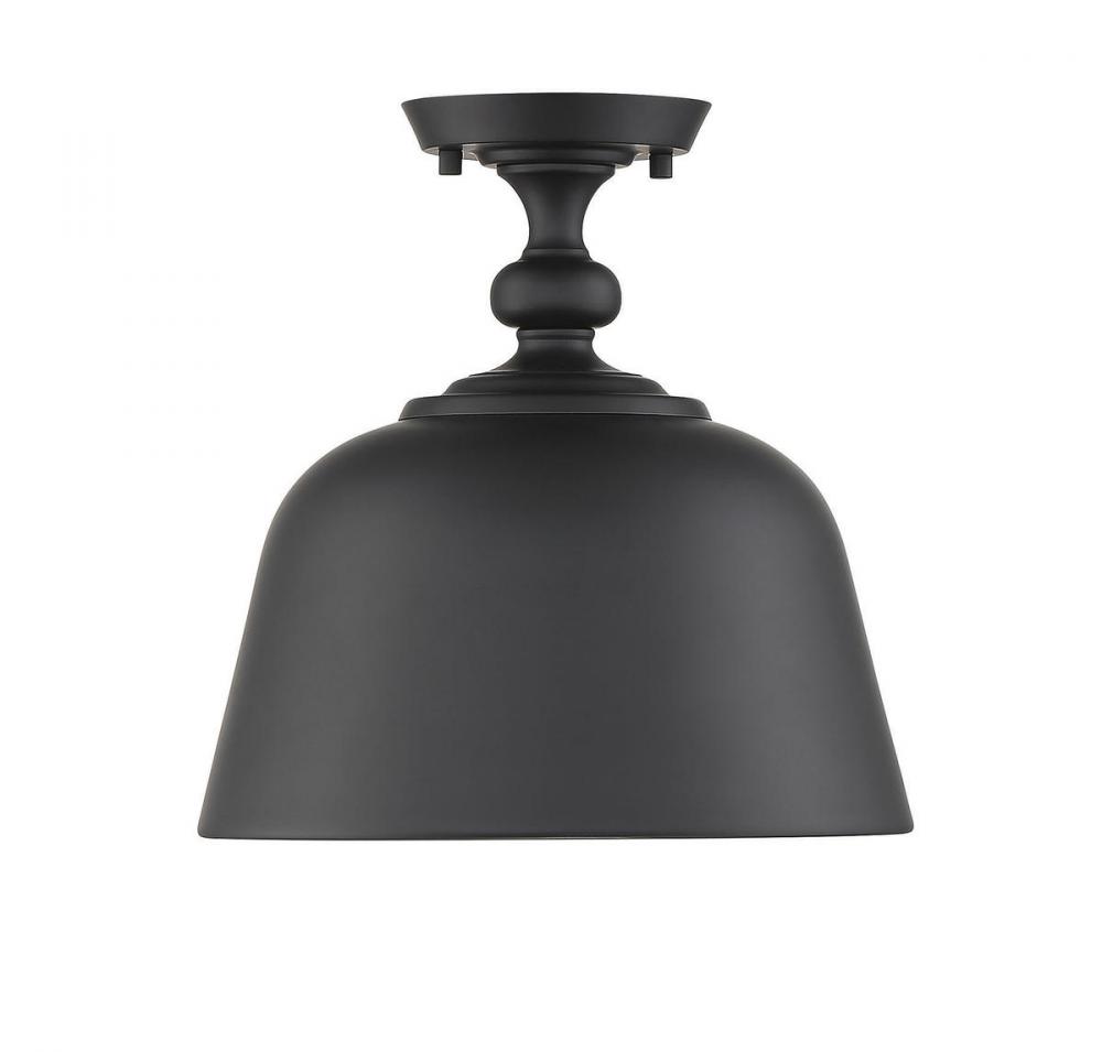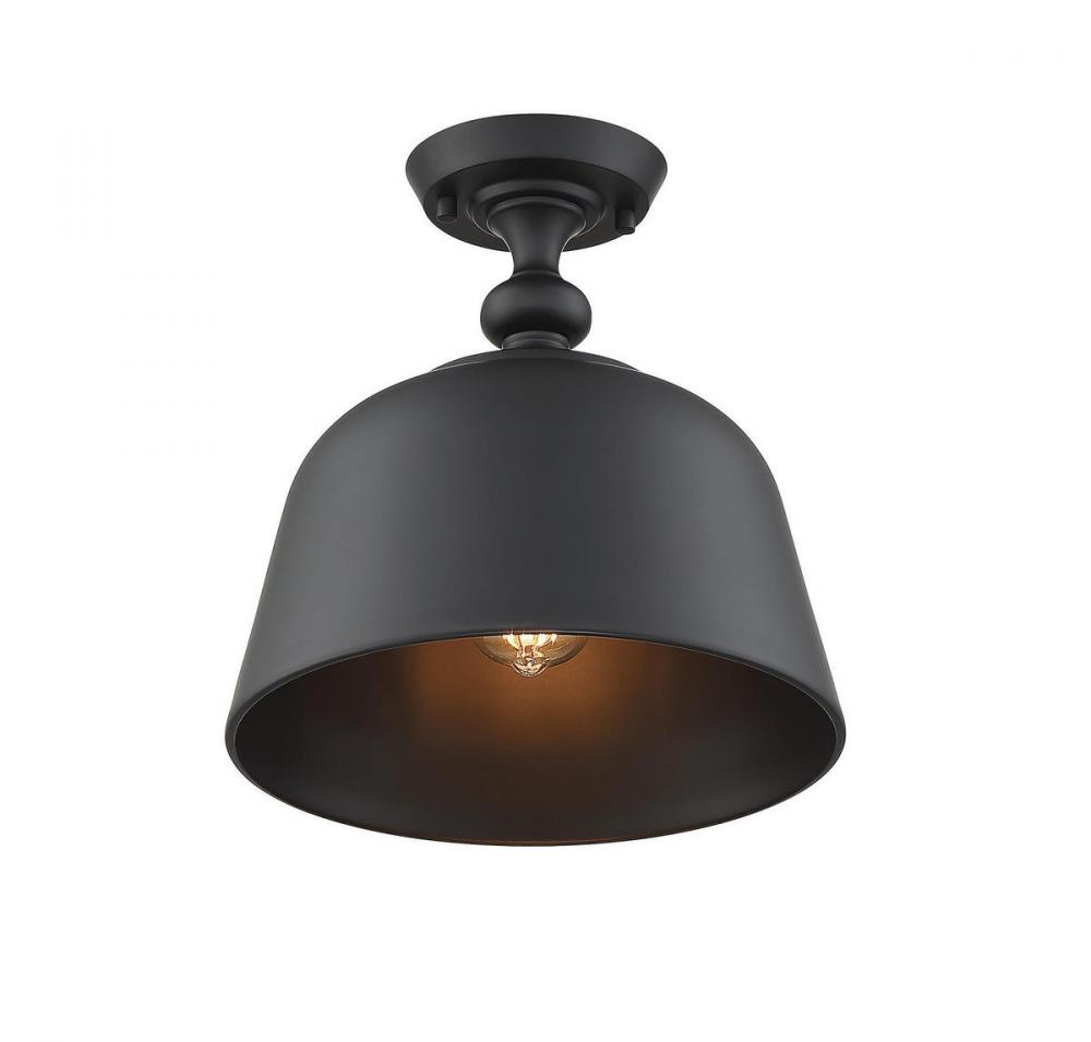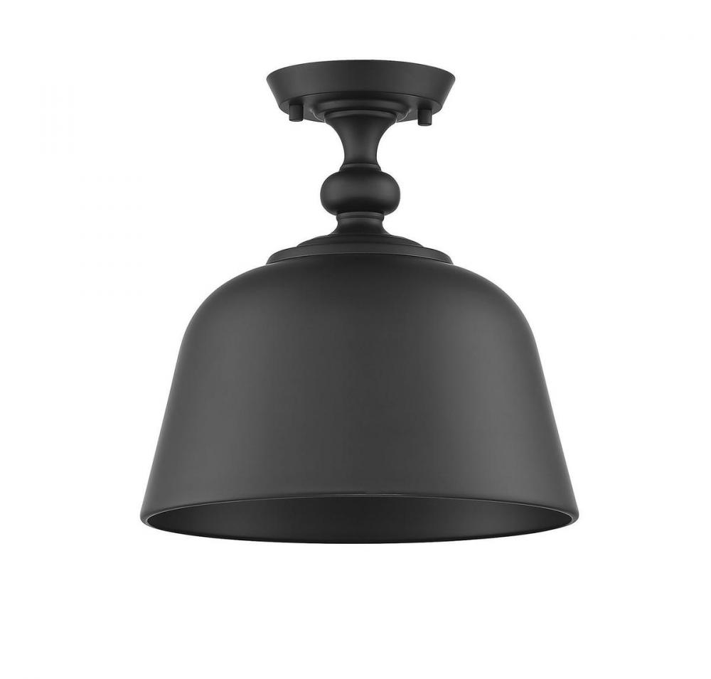 From Savoy House, this Berg 1-light ceiling semi-flush mount is a perfect blend of industrial style and traditional allure. It showcases an oversized metal shade that is finished in matte black, both inside and out, for a bright and focused glow. Above the shade, hardware details recall the curves of an elegant candlestick. Berg is perfect for times when you would like a more directed beam of light, such as in a small entryway or a kitchen. This fixture is 12" in width and 12" in height. Uses one standard size light bulb of up to 60 watts (not included).