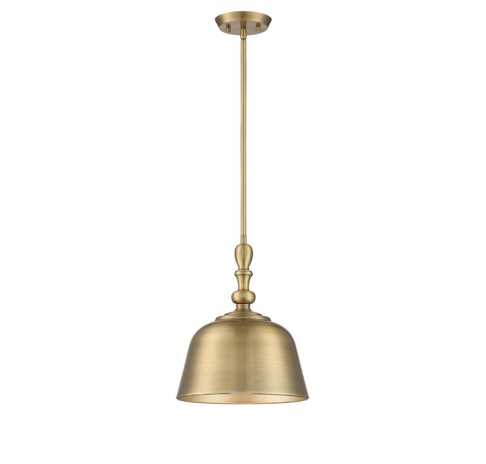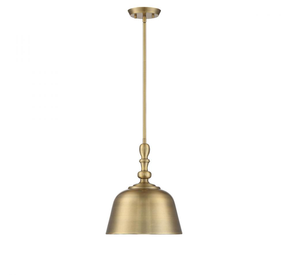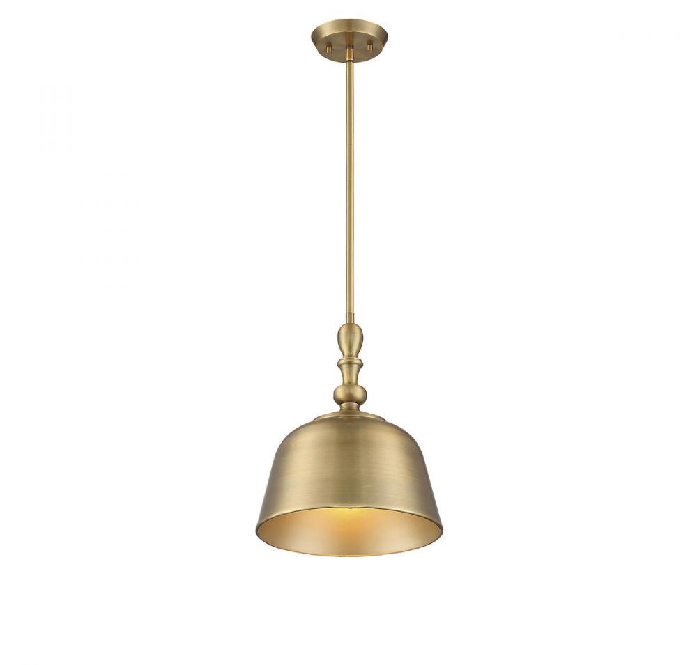 This Savoy House Berg 1-light pendant perfectly blends bold industrial style with a touch of traditional allure. Itoffers an oversized metal shade that isfinished in warm brass, both inside and out, for a bright, focused glow. Above the shade, hardware details recall the curves of an elegant candlestick. The Berg pendant is perfect for applications where you would like a more directed beam of light, like over a kitchen island. This fixture is 12ï¾" in width and has an adjustable height that ranges from 14" to 45.5". Uses one standard size light bulb of up to 60 watts (not included).
