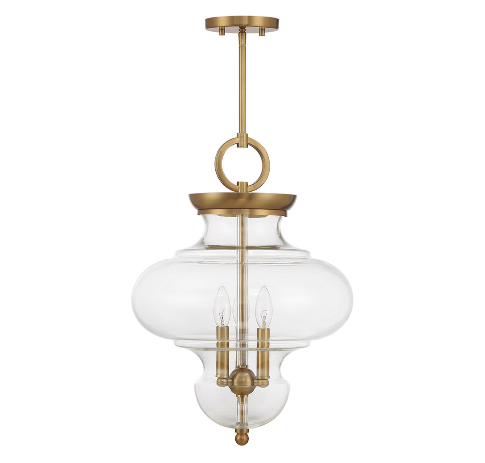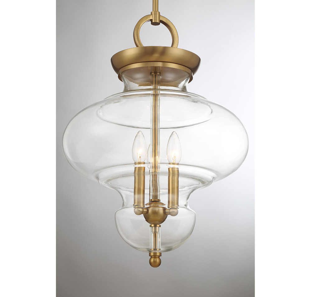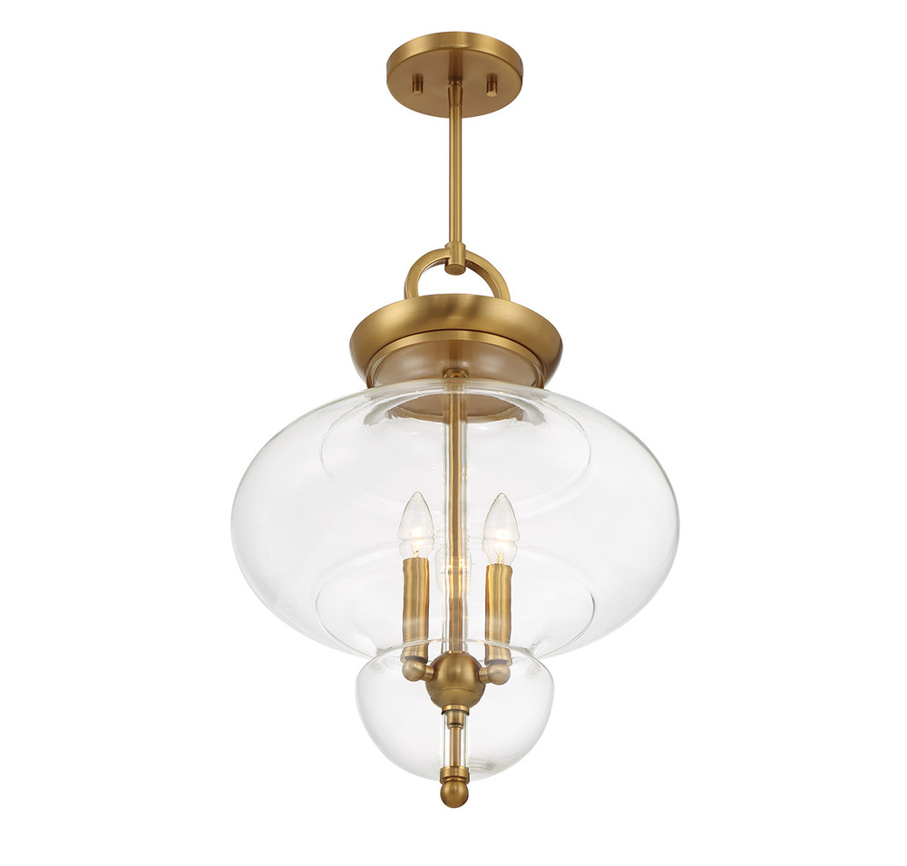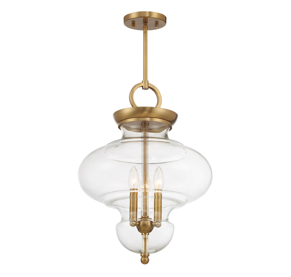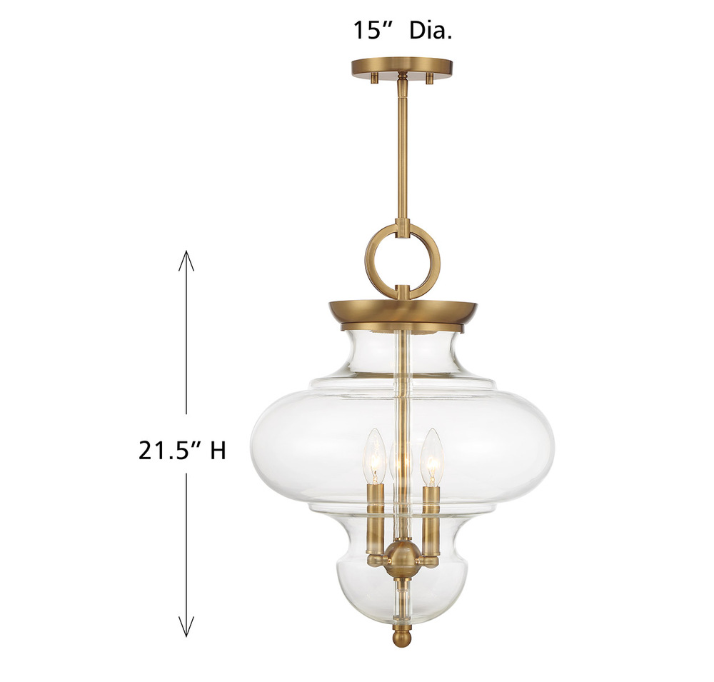 The Savoy House Bergdorf 3-light pendant is a beautiful way to impart any room with New Traditional style. A beautifully molded clear glass shade heightens the drama and is framed by a structure finished in Warm Brass. Bergdorf is 15" in width and has an adjustable height ranging from 21.5" to 75.5". Comes with four 12" downrods and one 6" downrod. Uses three candelabra size bulbs of up to 60 watts per bulb. Bulbs not included.