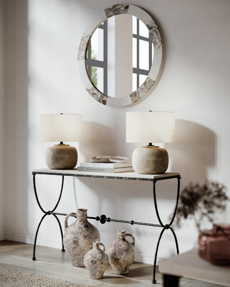 Patina is the name of the game with our Beton Table Lamp, the antiqued finish on the concrete lamp aptly named antique earth. This is one of our products that illustrates the talented finish artisans who so smoothly create the rough detailing that makes our new products look beautifully aged. We’ve topped this buxom piece with a light beige linen shade.