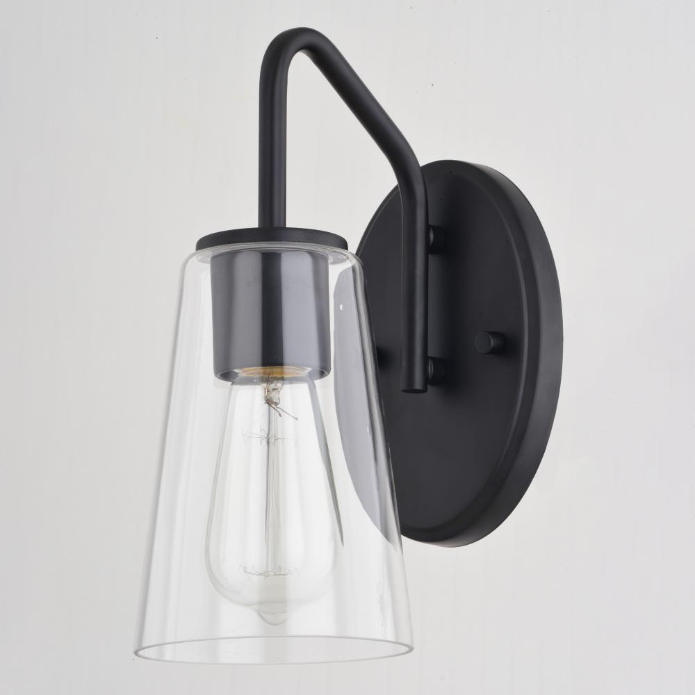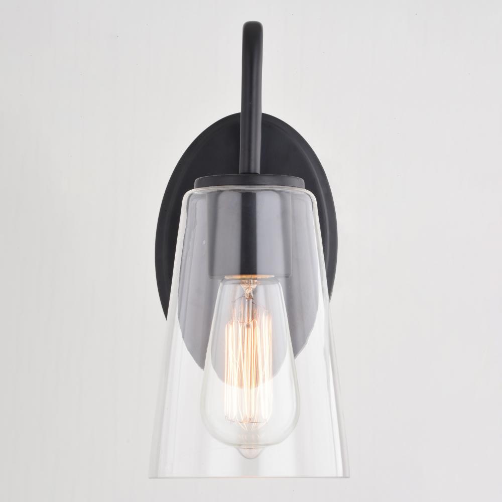 The Beverly collection provides a modern take on classic elegance. Uniquely curved arms in a matte black finish support clear tapered glass strongly anchored in place. Round matte black discs hold the glass creating a gentle, inviting aesthetic. This wall sconce is ideal for bathrooms, bedrooms, hallways, stairways, and foyers. Add this versatile 1 light vanity to any living space for the ultimate addition of transitional style.