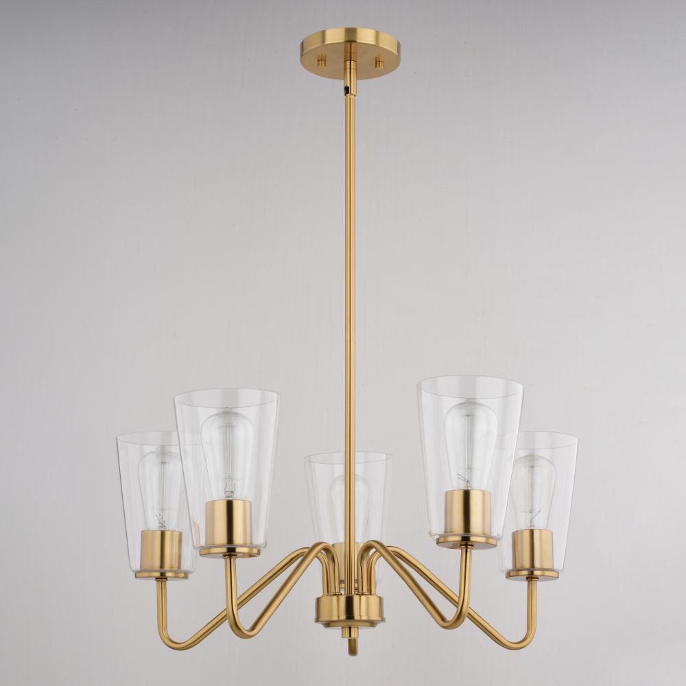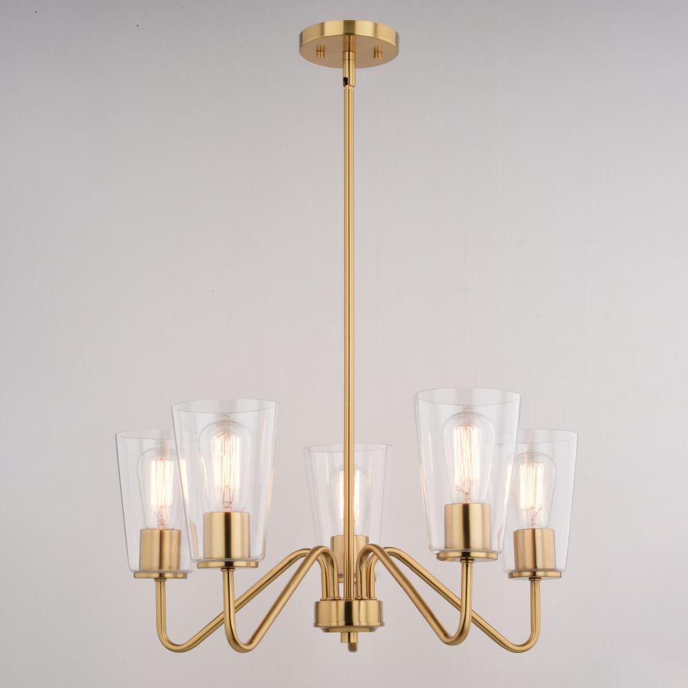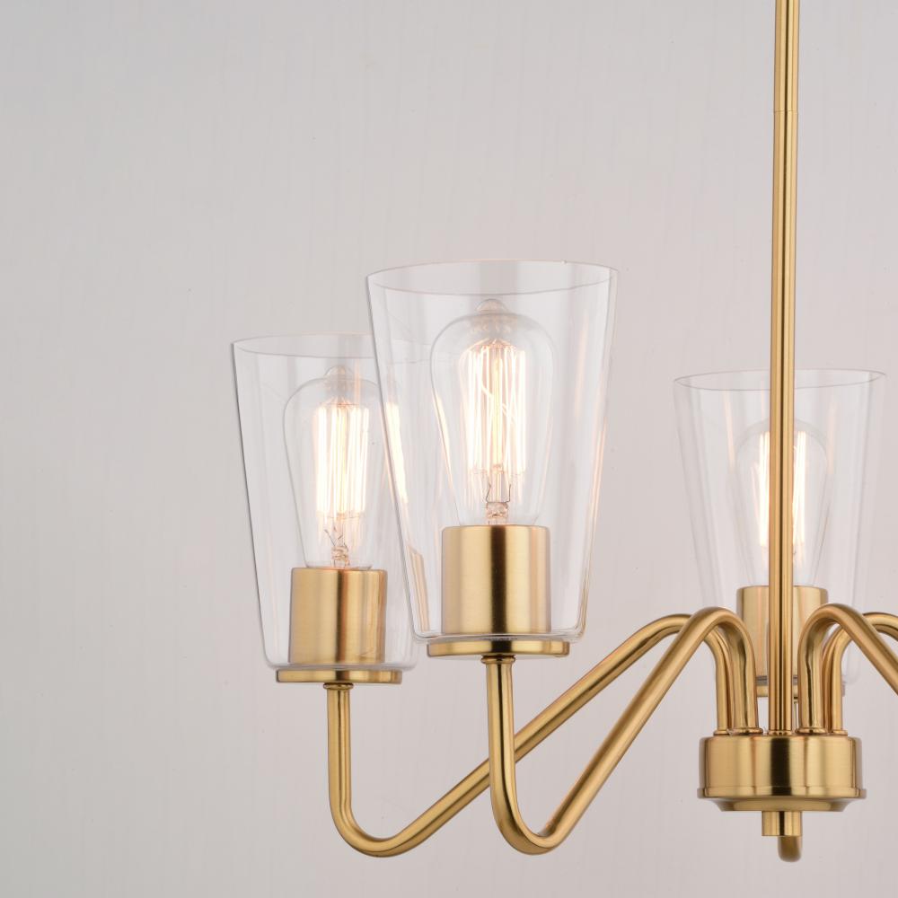 The Beverly collection provides a modern take on classic elegance. Uniquely curved arms in a muted brass finish support clear tapered glass strongly anchored in place. Round matte black discs hold the glass creating a gentle, inviting aesthetic. Add this transitional style chandelier to any living area, or dining space for the ultimate addition of style.
