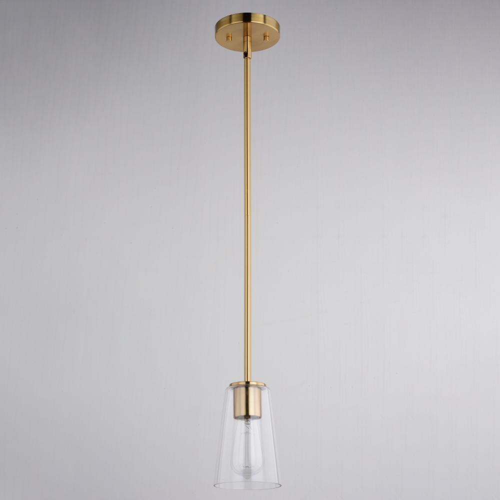 The Beverly collection provides a modern take on classic elegance. A muted brass finish supports clear tapered glass strongly anchored in place. Round muted brass discs hold the glass creating a gentle, inviting aesthetic. Add this versatile 1 light pendant in groups above any kitchen island or dining area for the ultimate addition of transitional style.
