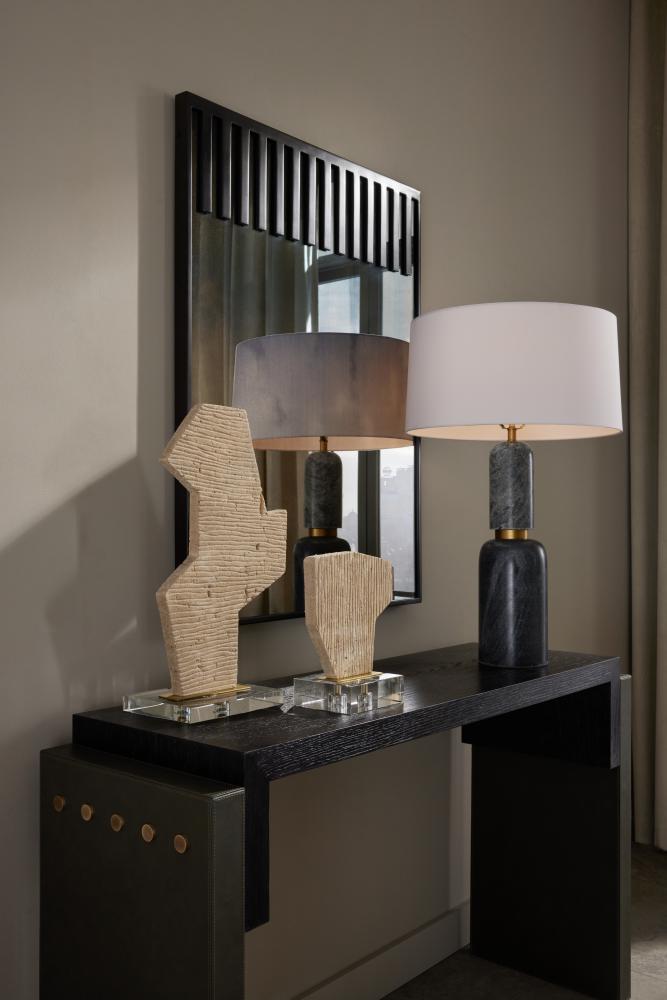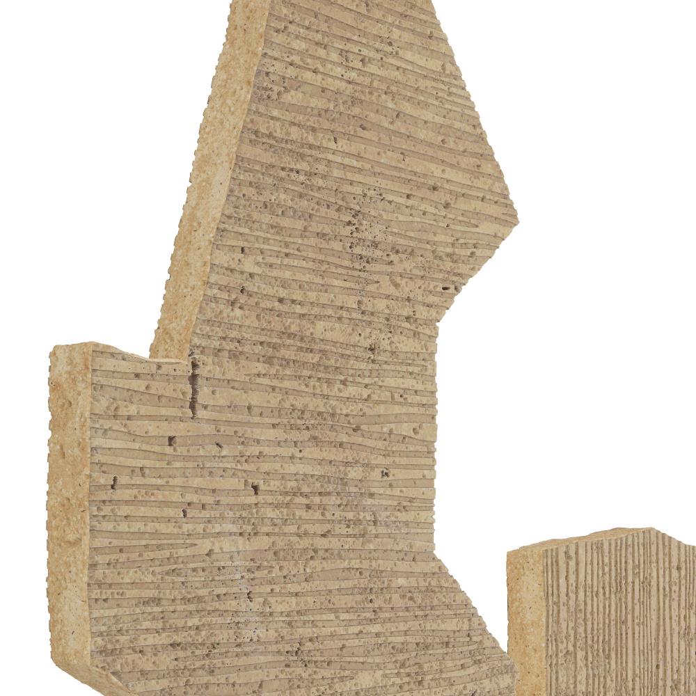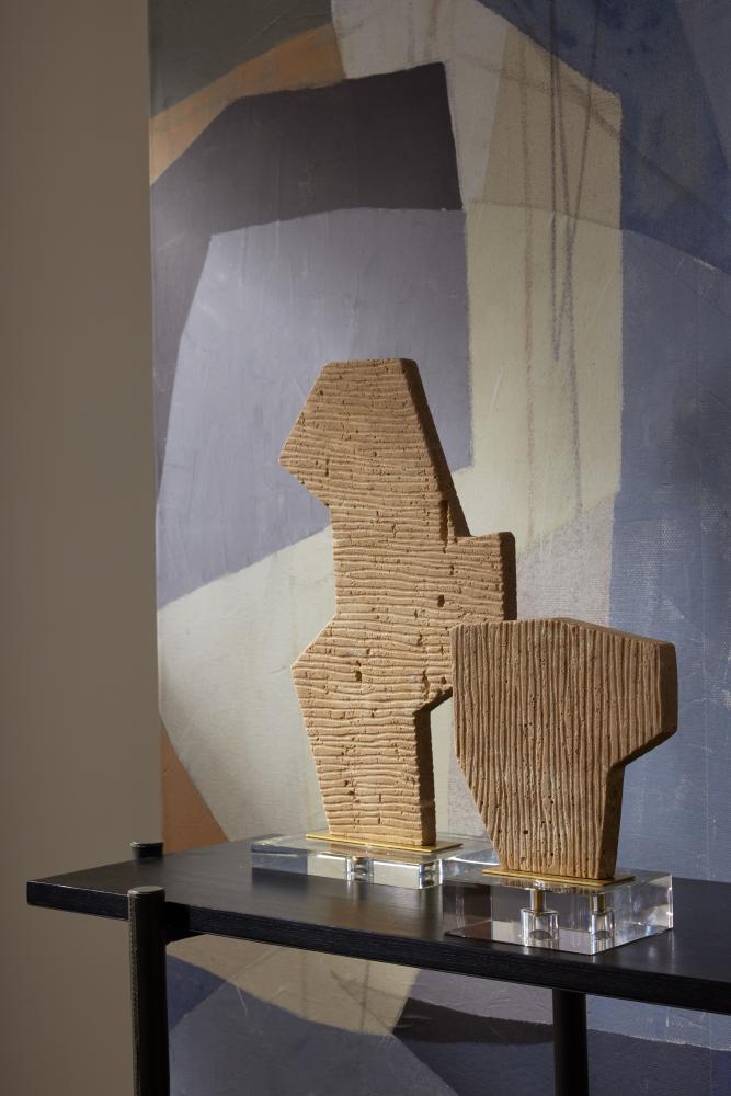 Textural formations recall structures from an ancient civilization. Crafted of faux travertine, this sculptural pair is anchored by antique brass finished supports on a clear crystal base. Finish will vary.