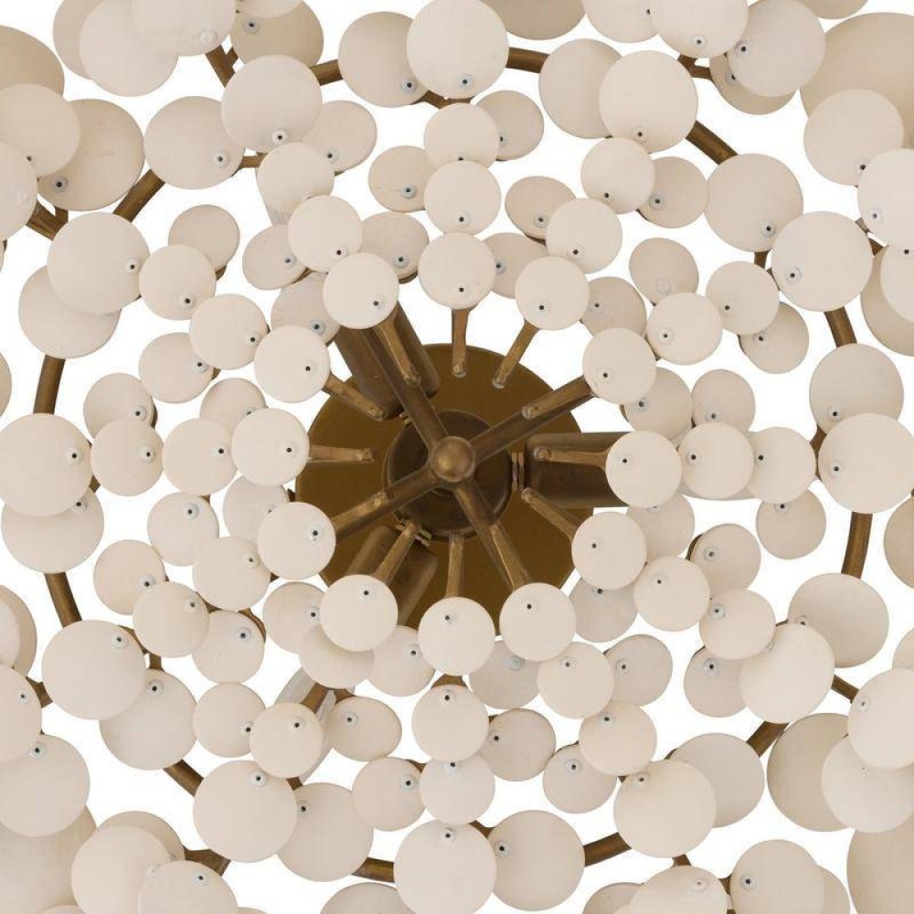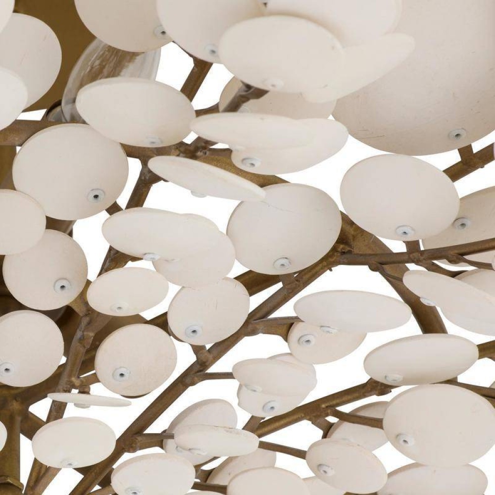 The lush allure of tropical foliage informs the Bilal. From afar, this botanically inspired fixture resembles metal but is cleverly constructed of coconut shells. Updated in a neutral ivory hue, it is a stylish companion to our Bilal chandelier. Suspended from an antique brass iron canopy. Finish will vary.