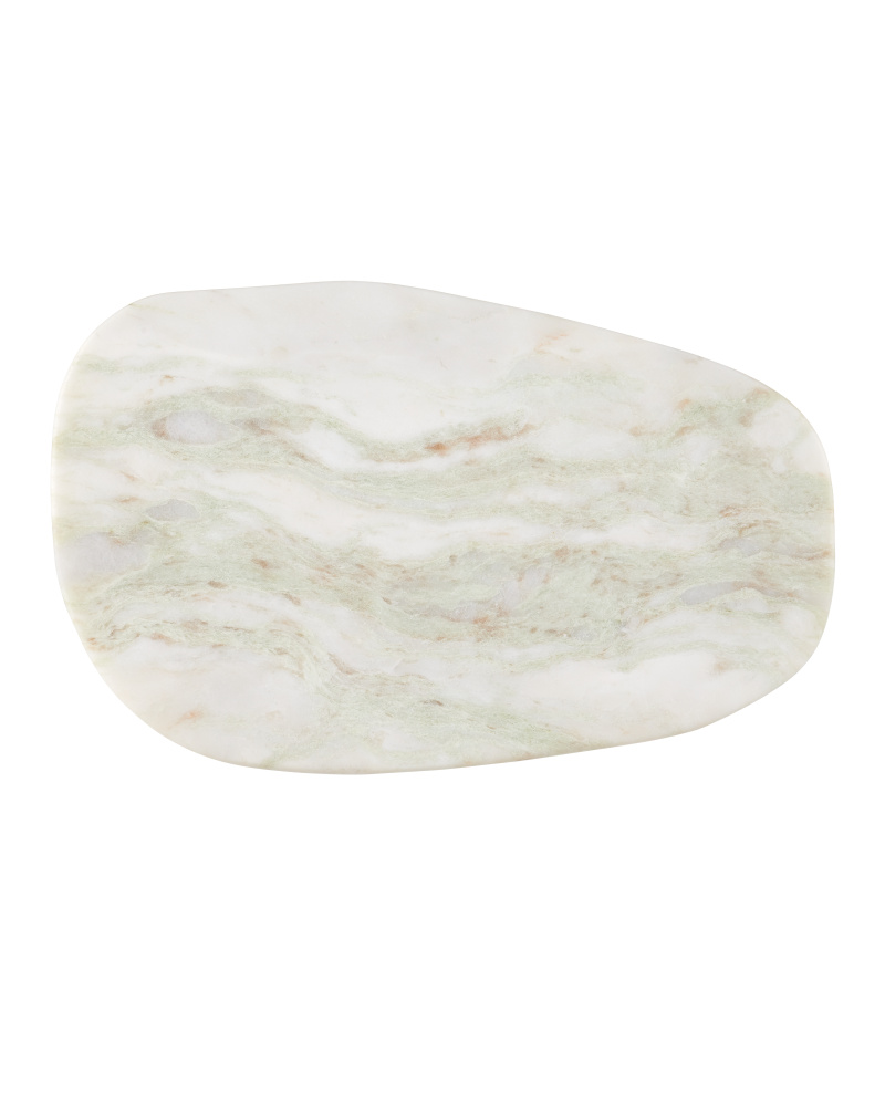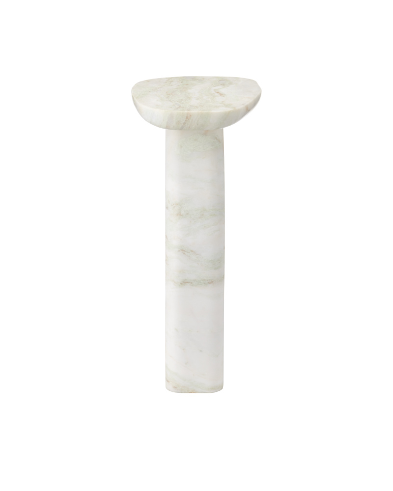 The Bilbao Aravali Onyx Accent Table has a geometric profile made from Aravali Onyx. The oculus cut-out brings its thick pedestal a sense of drama, and the body angles up on just one side to hold the top that sits asymmetrically. The white table is 16 inches tall. Because the Bilbao is made of a natural material, the veining in pale shades of pink and green will vary from piece to piece.