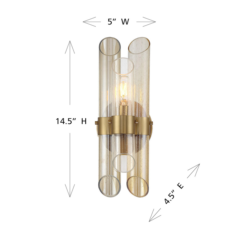 Adorn your home with the chic Art Deco style of the Savoy House Biltmore 1-light sconce, which features pipes of marvelously multi-toned clear, champagne and smoked glass held in place by central belts finished in Warm Brass. Biltmore is 14.5" in height, 5" in width and extends 4.5" from the wall. Uses one candelabra size bulb of up to 60 watts. Bulb not included.