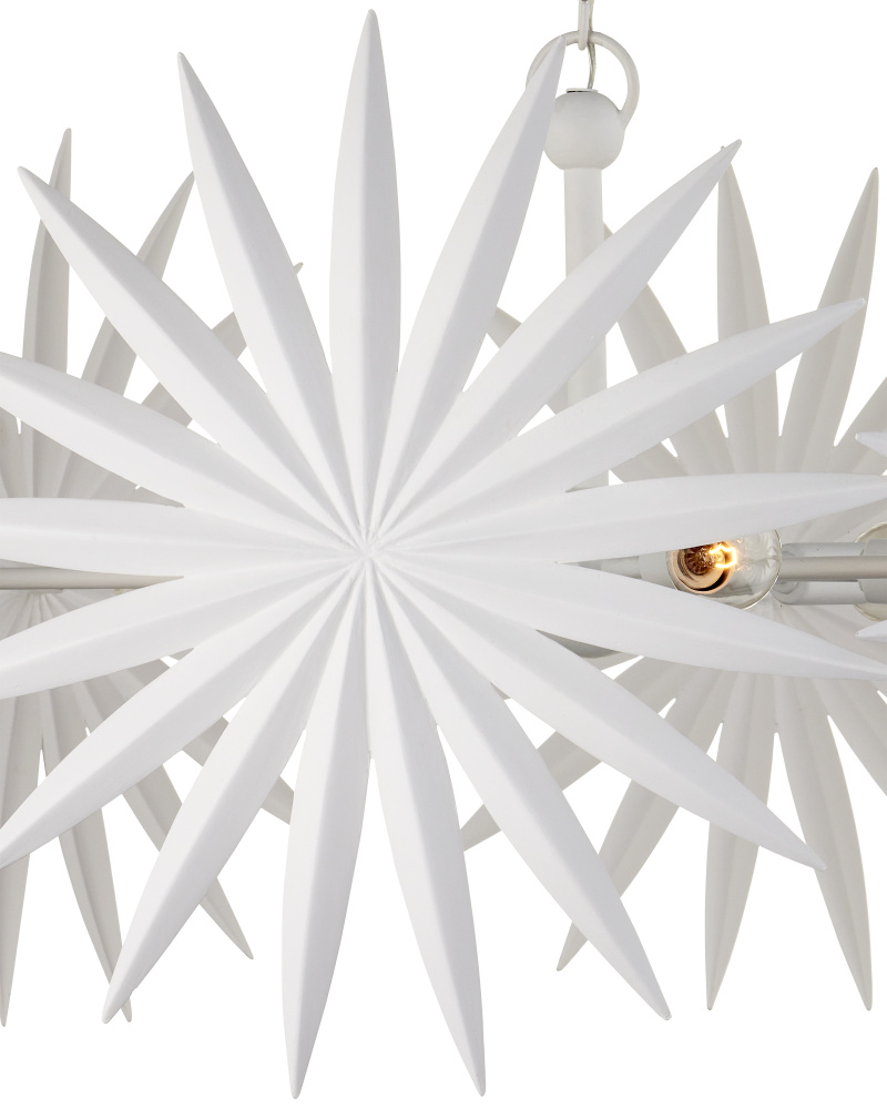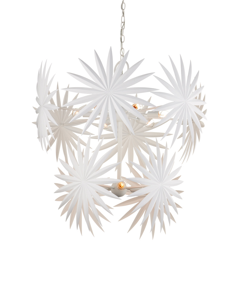 The Bismarkia Medium Chandelier was inspired by the noble Bismarkia palm, with its oversized fronds. Marjorie Skouras, who designed the chandelier, has stayed true to her love of nature for this creation. Her passion for the Yucatan, the surroundings in which she lives and through which she translates the flora and fauna into dynamic products in her studio, shines in this steel fixture covered in gesso white. The spiky ornamentations that splay around the bulbs bring immediate texture to the white chandelier. Adjustable from 39" to 107" with use of included chain/rod kit/cable. If your space calls for a longer drop, additional chain/rods/cable is available for purchase.