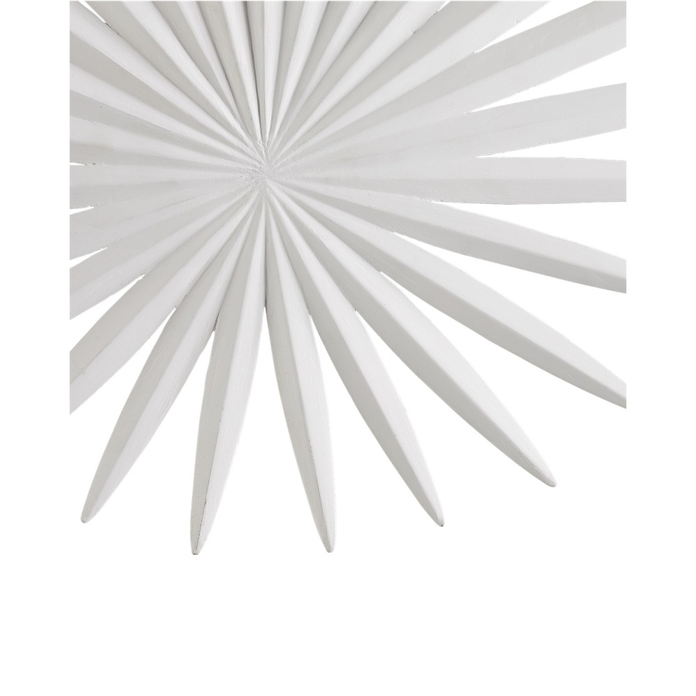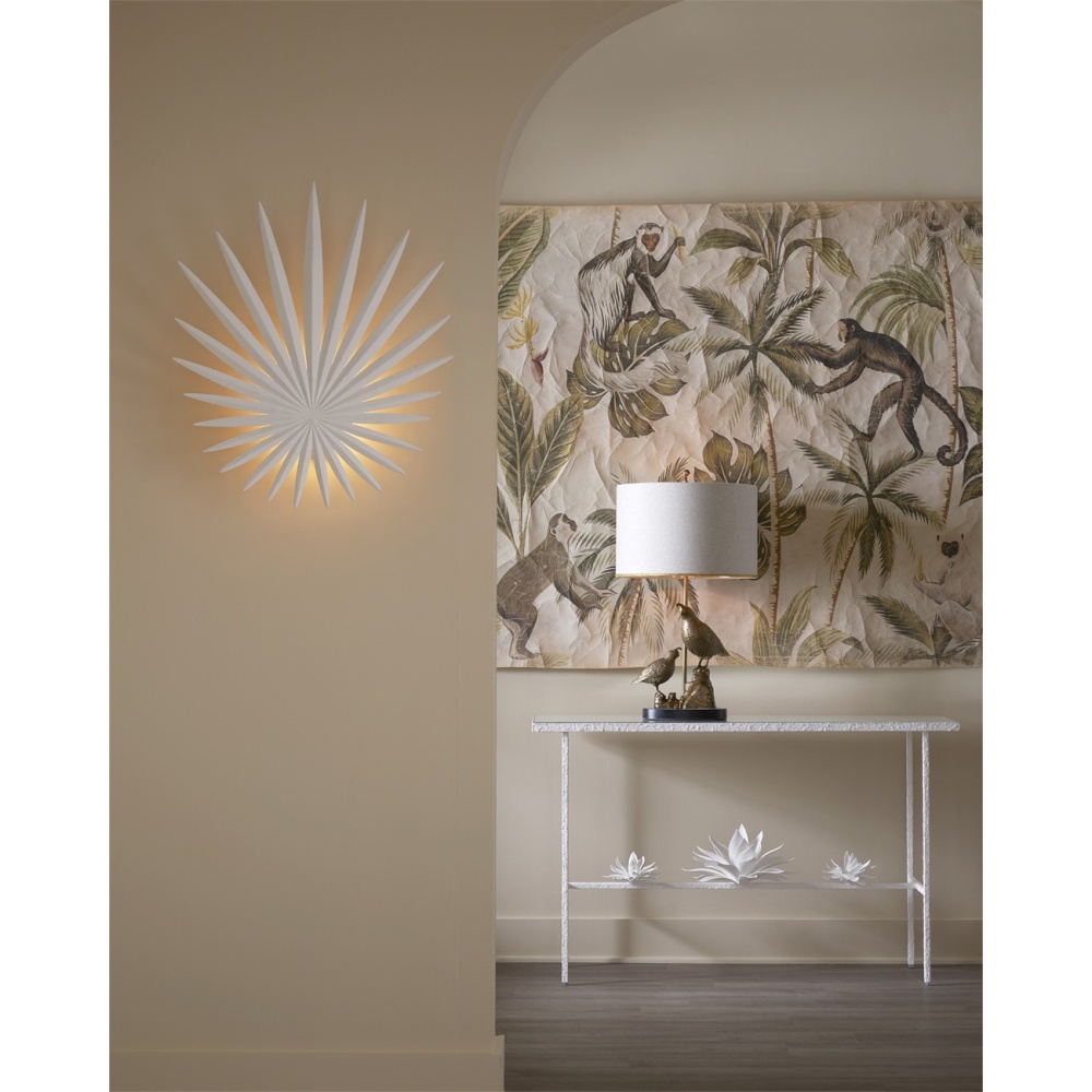 The Bismarkia White Wall Sconce was inspired by the noble Bismarkia palm, whose fronds are remarkably large. Marjorie Skouras, who designed the white sconce, has stayed true to her love of nature for this creation. Her passion for the Yucatan, the surroundings in which she lives and through which she translates the flora and fauna into dynamic products in her studio, shines in this steel fixture covered in a crisp gesso white finish. The spiky leaf sconce is lit by integrated LED technology.