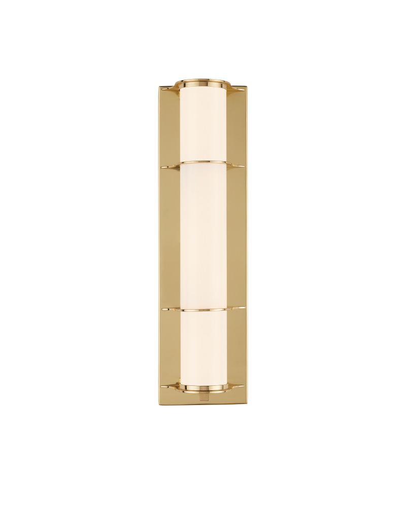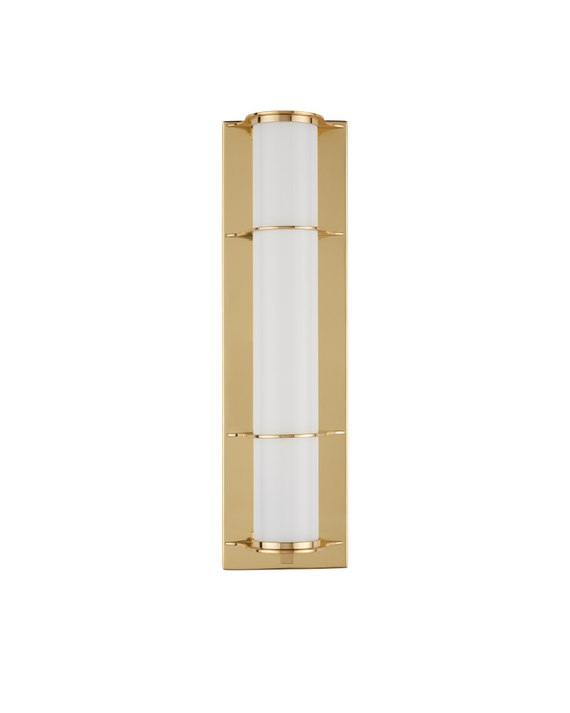 The Blaine Brass Bath Wall Sconce has a tubular design, with the milky glass tube set into the metal rings that match the wallplate in a polished brass finish. Perfect for lighting up a bathroom vanity, the Blaine has a simple design that will work well within a number of design styles.