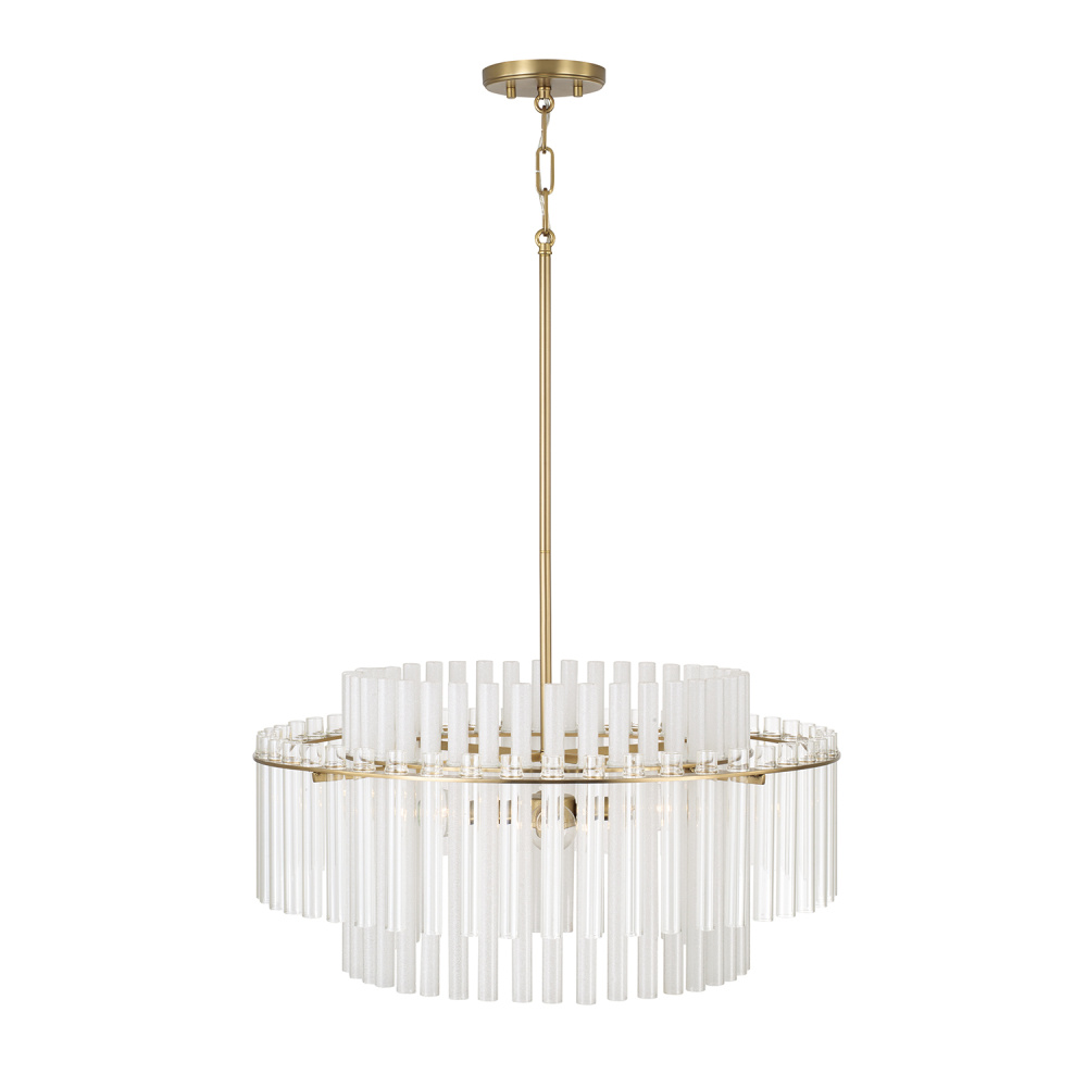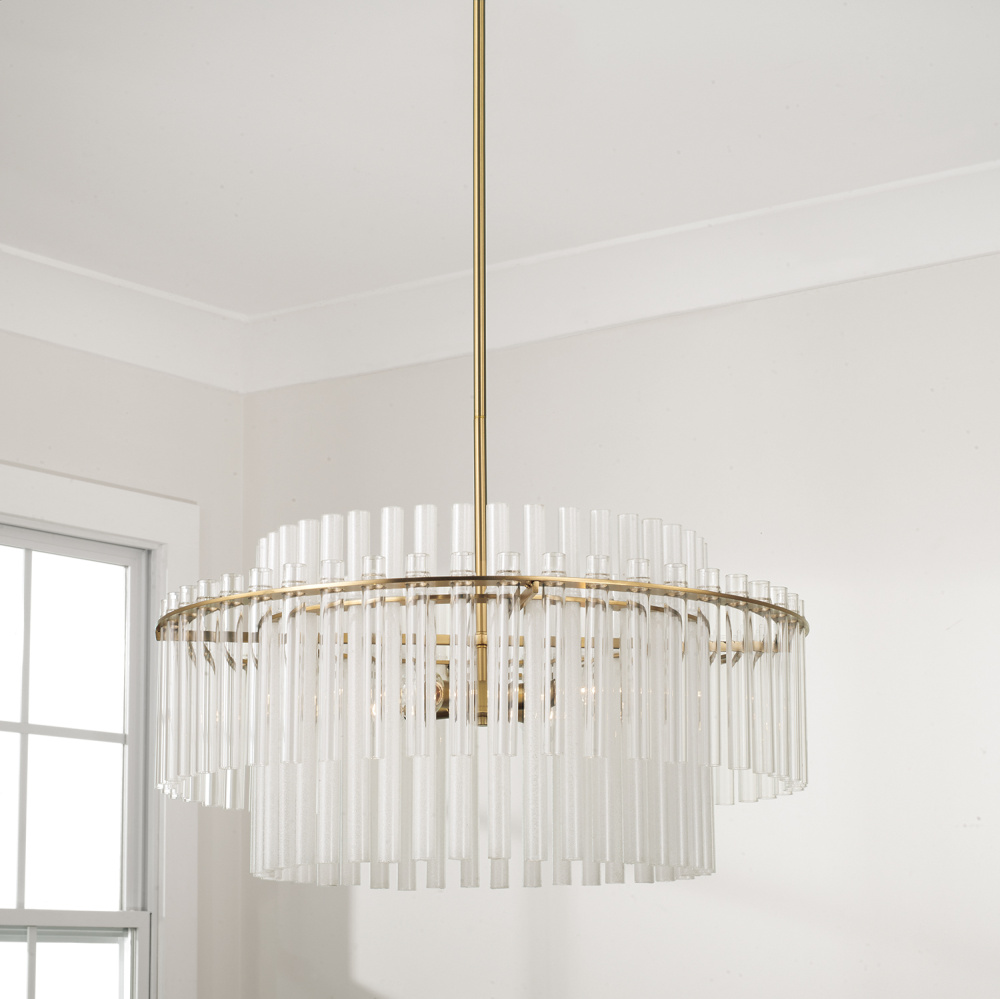 Illuminate captivating dimension. With an inner ring of long, Etched glass tubes nestled inside an outer ring of shorter, clear glass tubes, the Blair Large Pendant brings layers of enchanting shine to any space. The elegant Aged Brass finish perfectly complements the cascading silhouette.