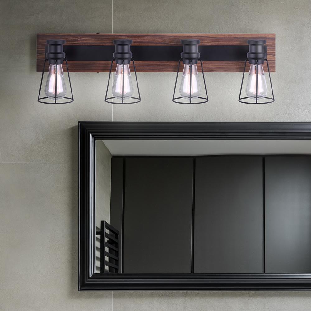The Blake 4 Light Vanity, Wood Finish captures the spirit of art deco flair. A stunning piece that combines Black/Faux Wood and User Replaceable Bulb to create an unforgettable ambiance.