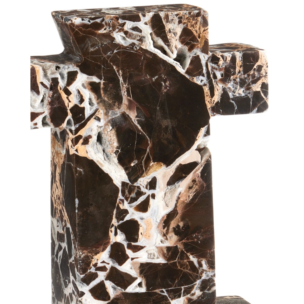 The Blount Marble Object is a geometrically complex sculpture made of Emperador stone, a type of marble that is known for its rich dark brown color and natural pitting. The bold veining is also a characteristic of this stone that is mined in Spain. At 13.5 inches tall, the decorative accessory will be uniform in shape from piece to piecem but the surface features will vary slightly.