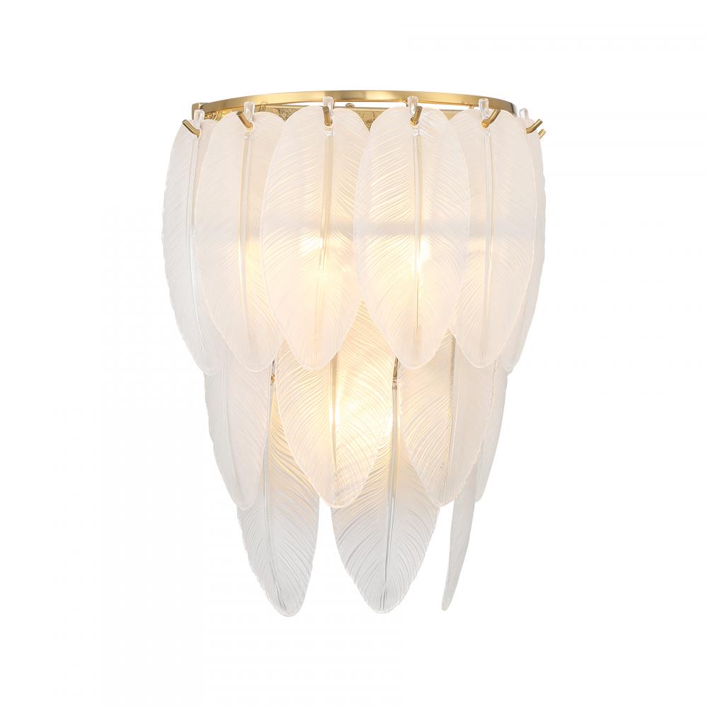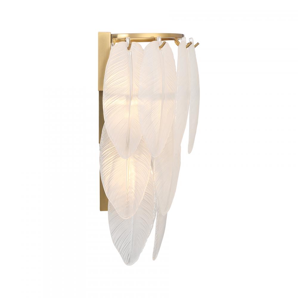 The Savoy House Boa 3-light sconce was designed by Breegan Jane, an award-winning interior designer and TV host based in Los Angeles. Accordingly, Boa is infused with luxurious Old Hollywood glamour. Frosted glass feathers cascade down in overlapping rows, creating a look that is sure to turn heads, and the Warm Brass finish is a perfect example of how Breegan uses metallics to elevate her designs. Boa is 14" in height, 10.5" in width and extends 6" from the wall. It uses three candelabra size bulbs of up to 60 watts per bulb. Bulbs are not included. This sconce is damp area rated.