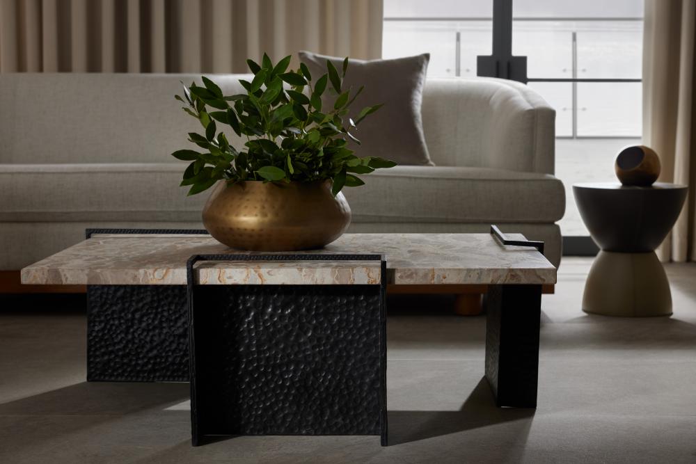 A refined mix of materials makes an intriguing pairing in a naturally textured marble and laser-cut iron Boda cocktail table. Three intersecting planes of textured blackened iron "float" a capri marble top, resulting in a surprisingly ethereal effect. Finish will vary.