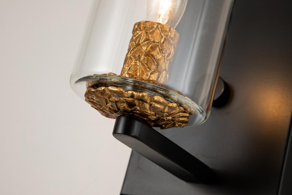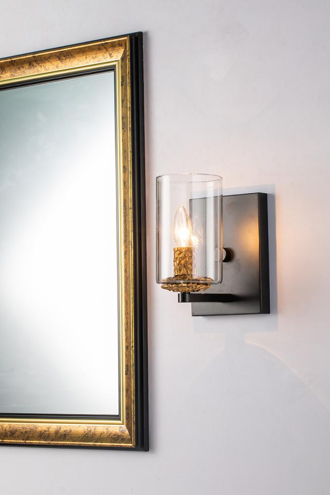The Bolivar 1-Light Sconce blends vintage charm with modern style. Featuring mixed gold and Black finishes, a clear glass cylinder, and an antique gold candle sleeve, it adds elegance to any space. The sleek black backplate completes the look.