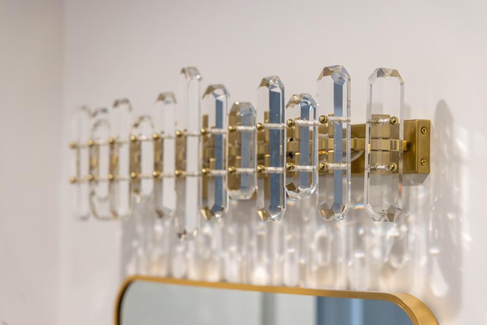 The Bolton Collection exudes glamour and luxury when placed as a focal point in the room. The varying sized faceted cut crystal panels are secured to a floating steel frame. The unique crystal prisms reflect beautiful light that creates an endless sparkle that elegantly blend with many home décor styles.