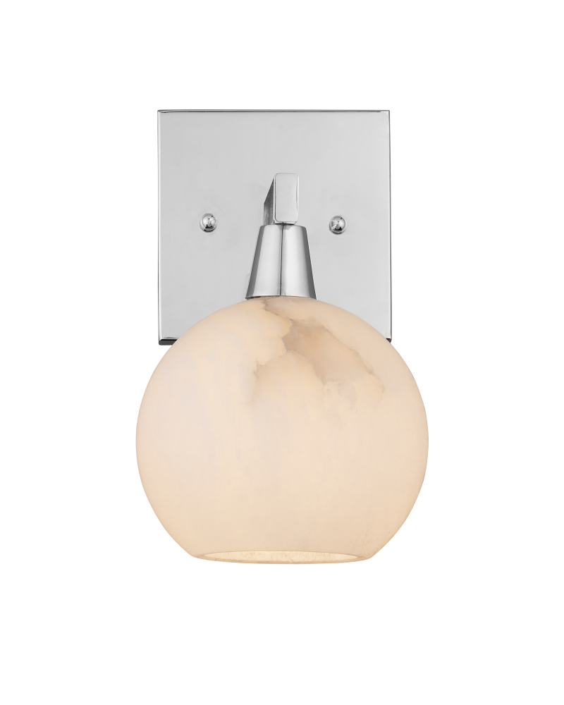 The Bombelles Nickle Bath Wall Sconce was designed to spread abundant light over a bathroom counter, the shiny silver sconce joining others in the Bath Collection. The globe will be luminous when it is lit, as it is made of natural alabaster, and the polished nickel finish on the metal intensifies the coolness of the design. Alabaster is a natural material, so there will be slight variations in each of the fixtures. The Bombelles can be mounted with the globe pointing up or down.