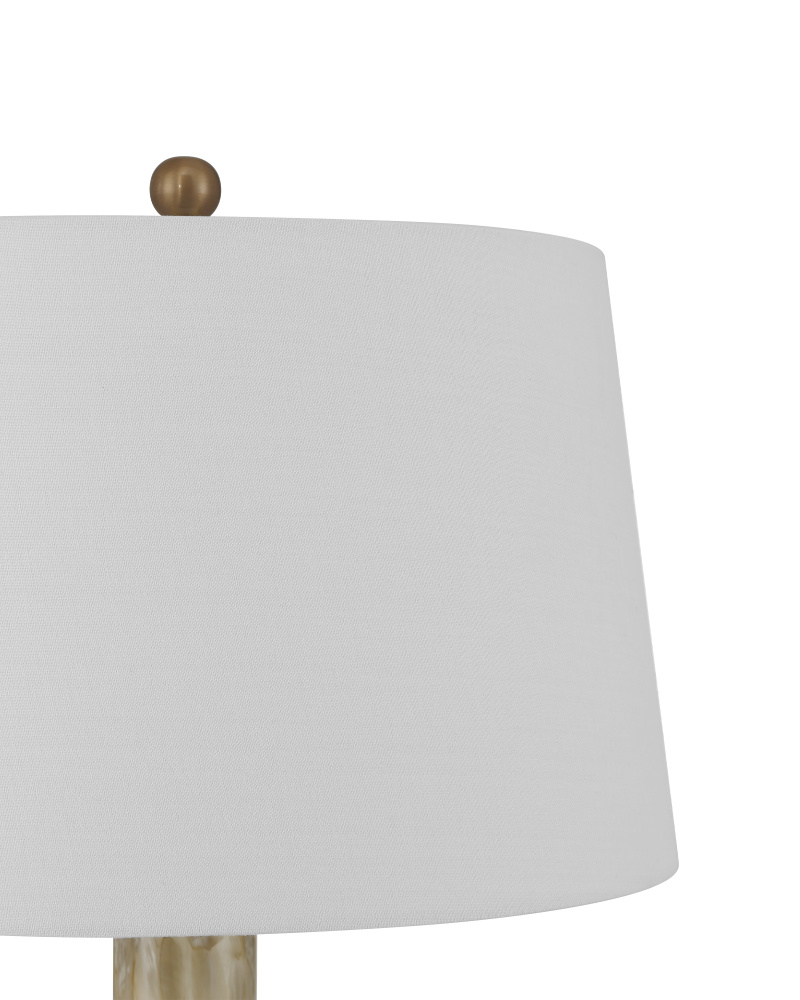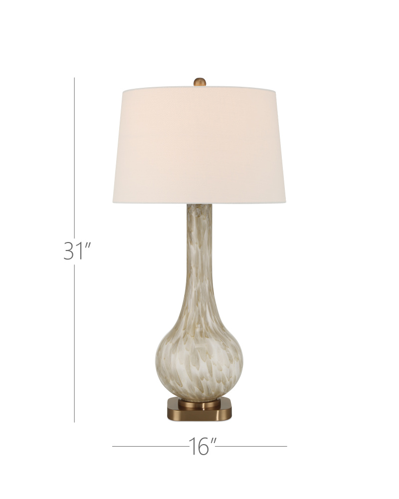 The Bombon Table Lamp is a remarkable caramel-colored glass lamp that illustrates the artistry when fusing and marbling techniques are combined, as the marbling creates the patterns that seem to float on the surface to bring it a sense of movement. The paleness of the glass is contrasted by the warmth of the stacked metal base and round finial in an antique brass finish. Because this lamp is created using a highly artisanal process, slight variations will occur.