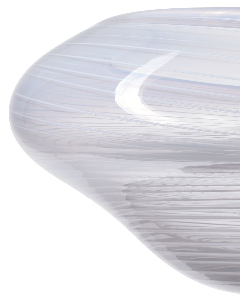 With its ethereal glow, the Bonaventure Bowl is crafted from pale gray mouthblown glass with swirling lines that create delicate textural striations across its surface. The effect is achieved when it is swirled while thin white glass rods are adhered to it as it is blown. The shape is realized when molten glass is allowed to drop from the blowing pipe into an orb and is carefully shaped by hand before being cut at the top with scissors to form its final silhouette. This makes each bowl one-of-a-kind.