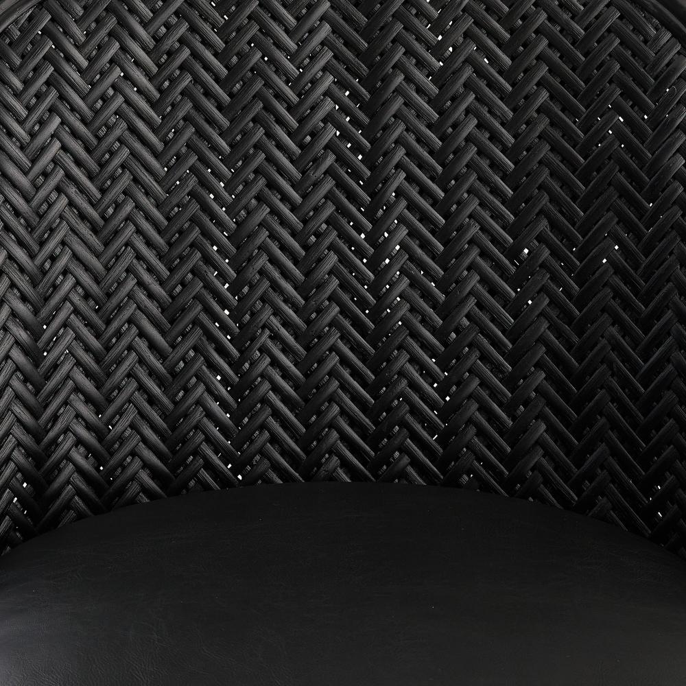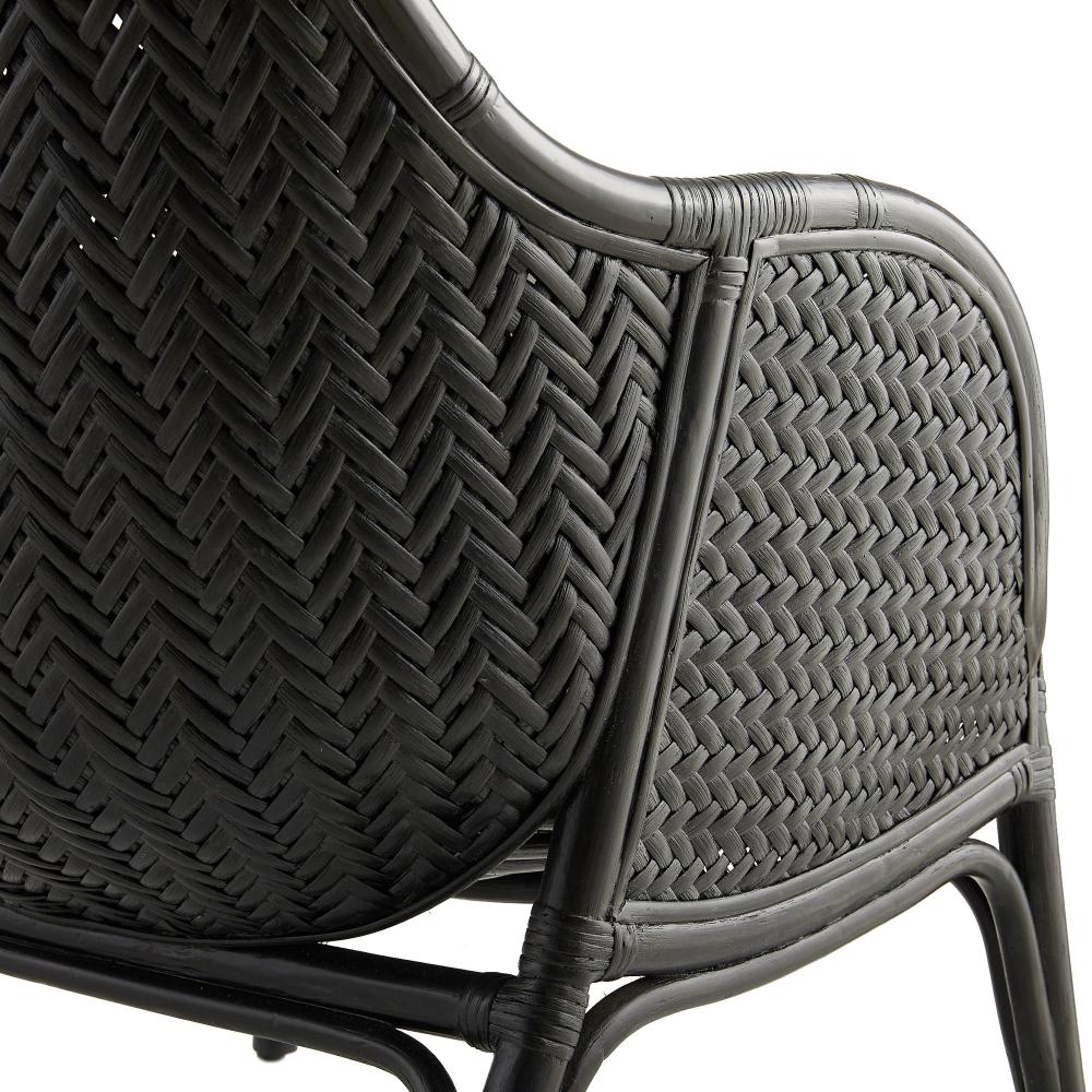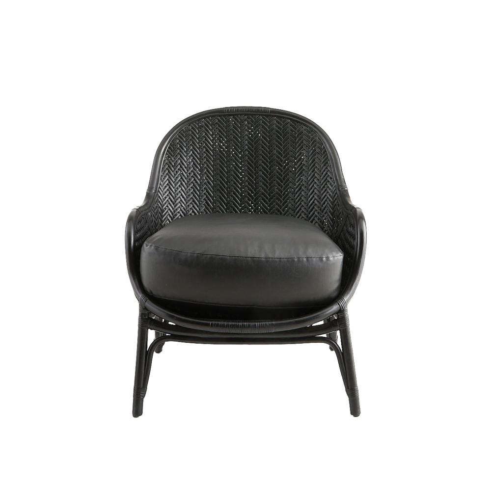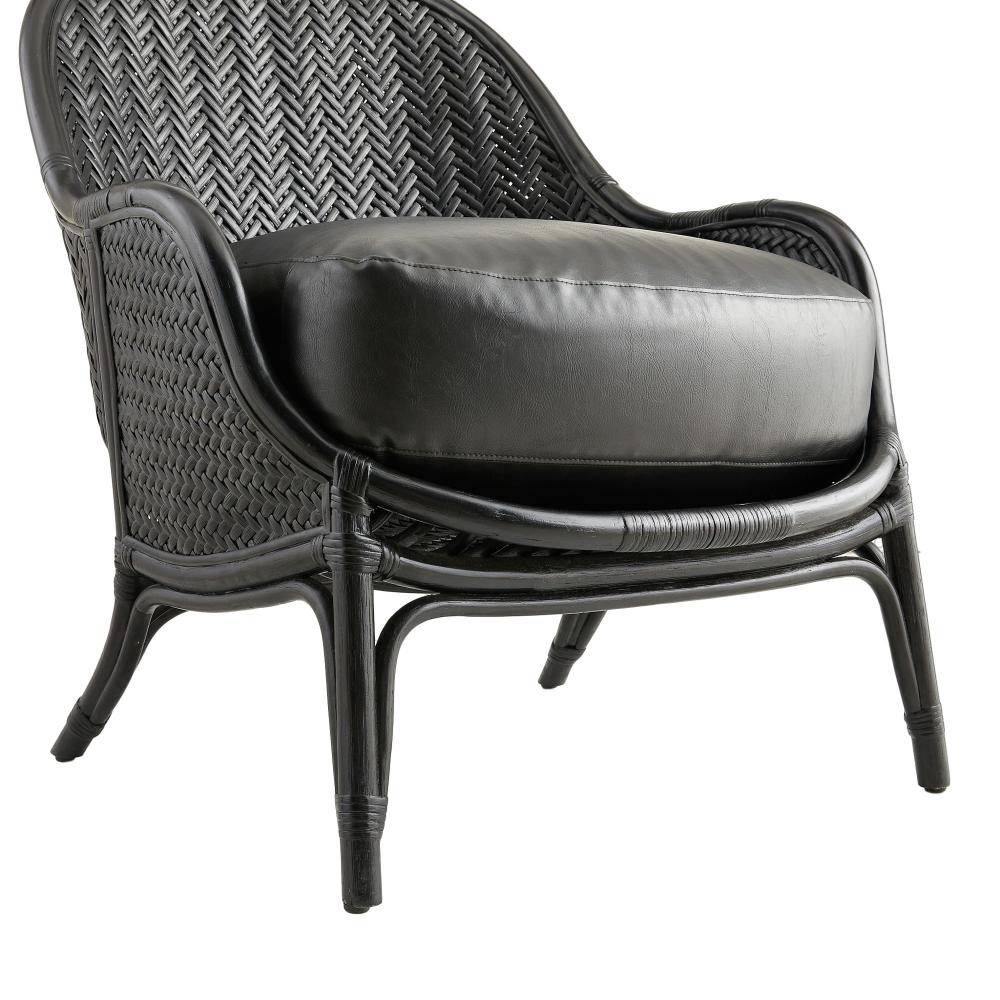 Sophisticated black rattan updates a traditional wicker lounge. Designed with rounded armrests and an egg-shaped back to encircle the body. Woven in a fine herringbone pattern and layered with a vegan leather seat in noir. Rattan and leather will vary.