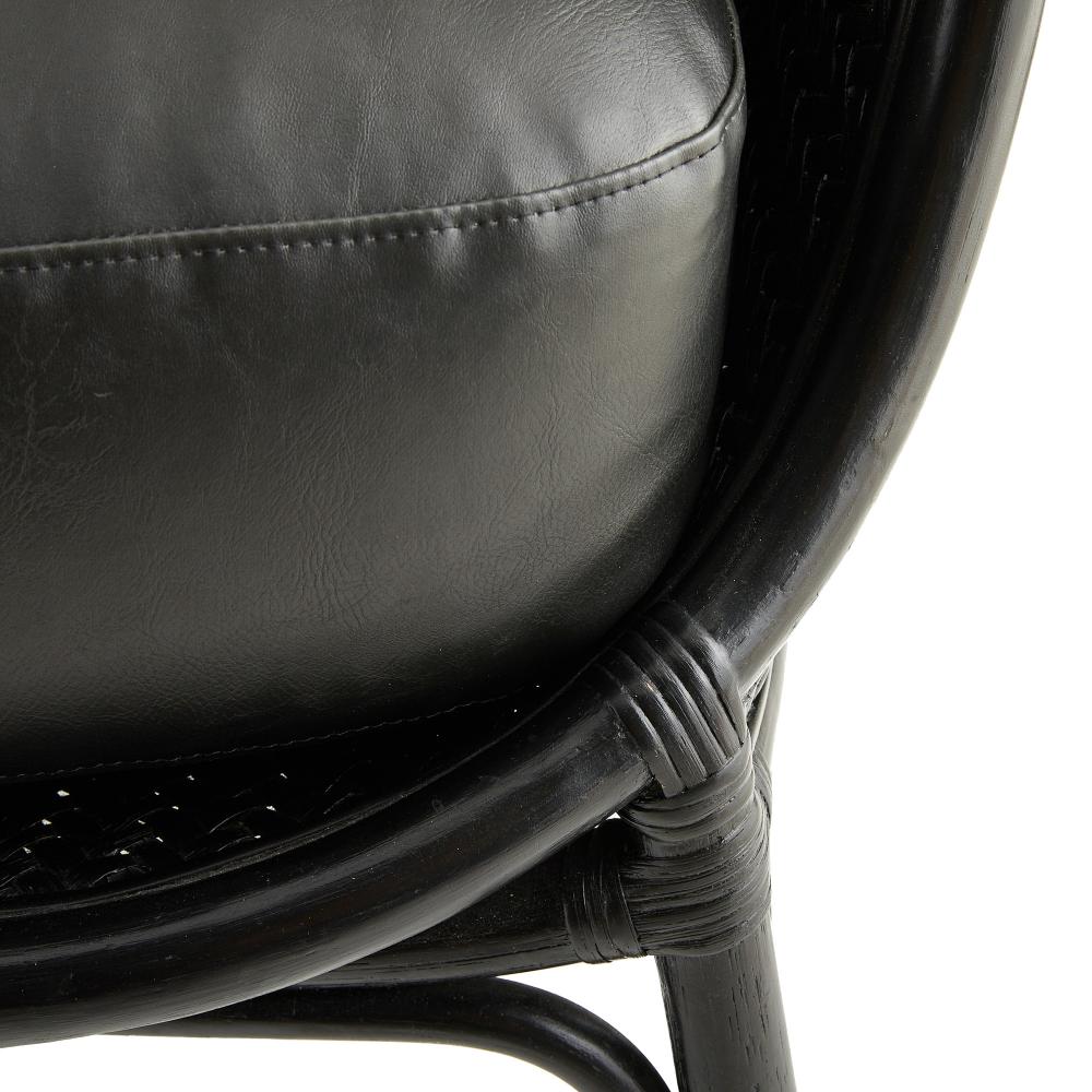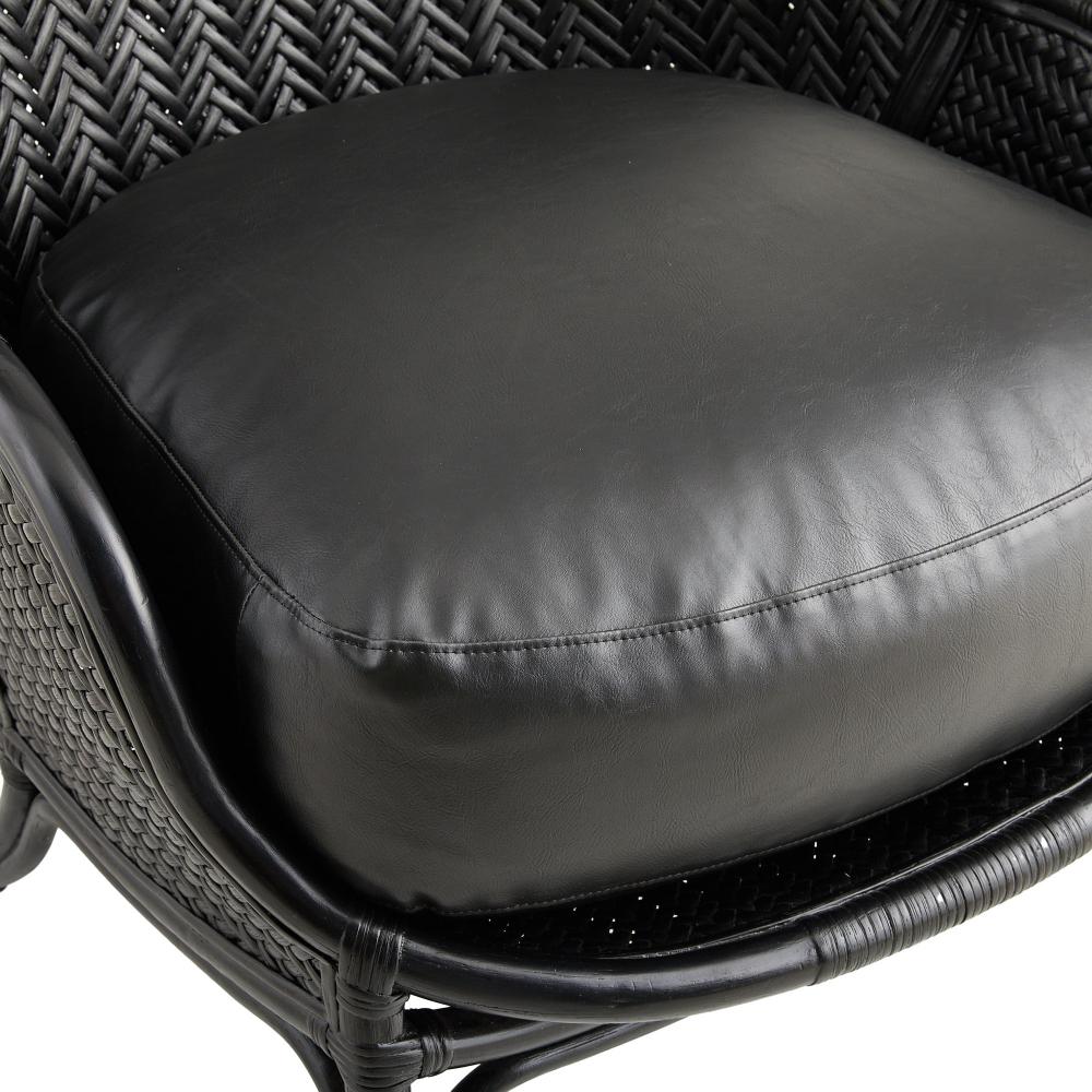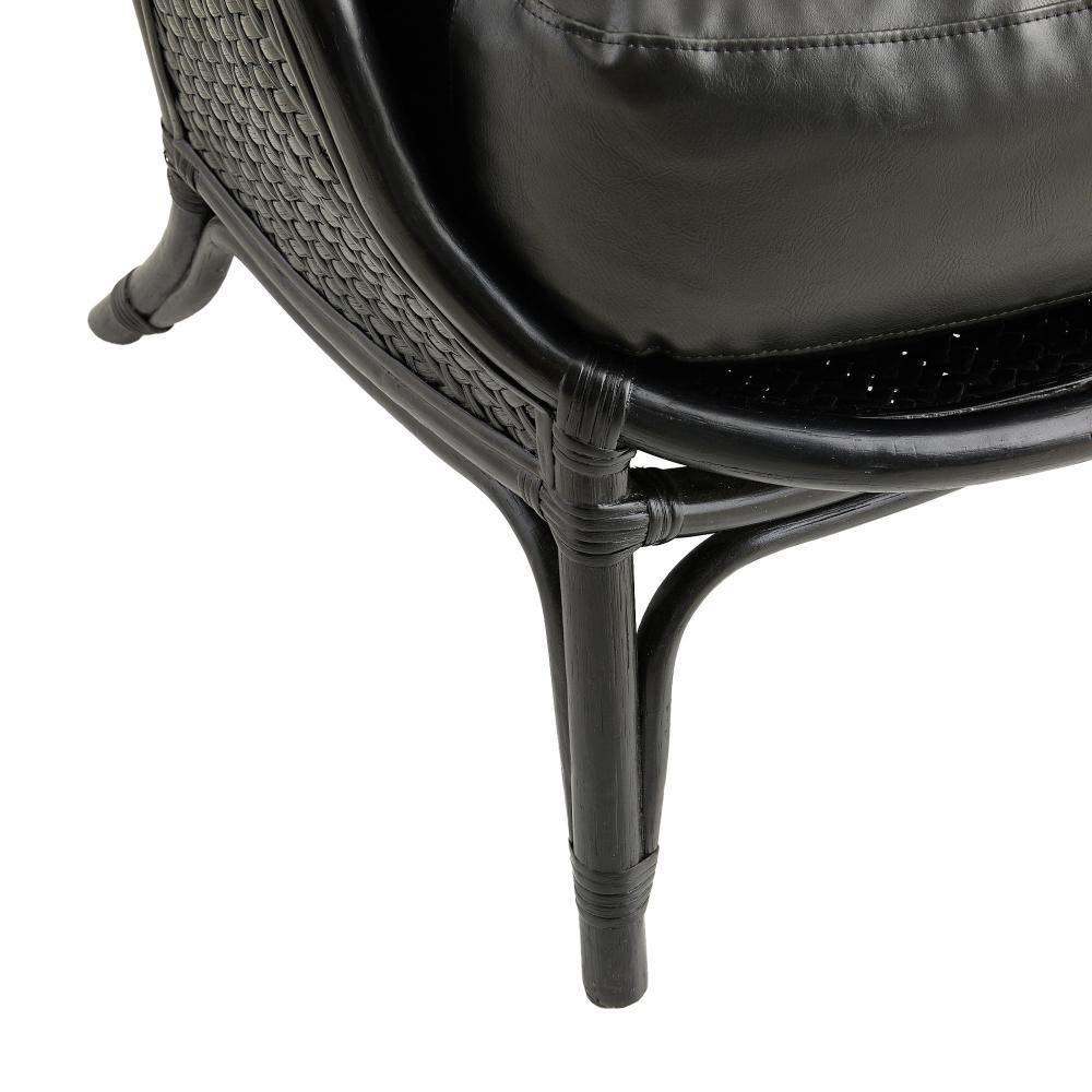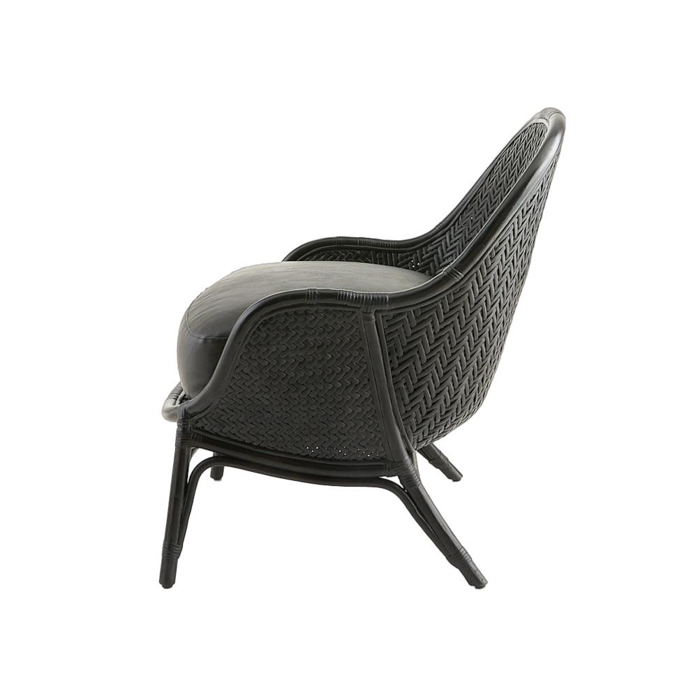 Sophisticated black rattan updates a traditional wicker lounge. Designed with rounded armrests and an egg-shaped back to encircle the body. Woven in a fine herringbone pattern and layered with a vegan leather seat in noir. Rattan and leather will vary.