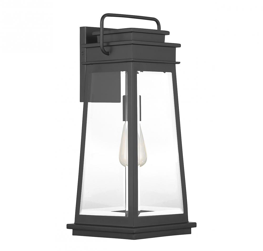 The Savoy House Boone 1-light outdoor wall light showcases a classic lantern-style lighting look with panes of clear beveled glass and a matte black finish that adds versatility. Boone is 20" in height, 8.25" in width and extends 8.5" from the wall. It uses 1 standard size bulb with a max of 60 watts (bulb not included).