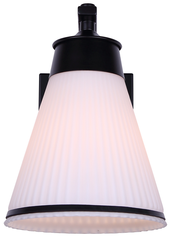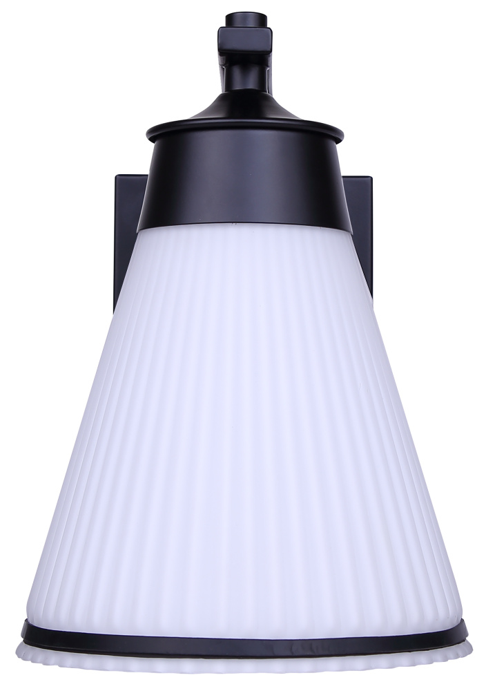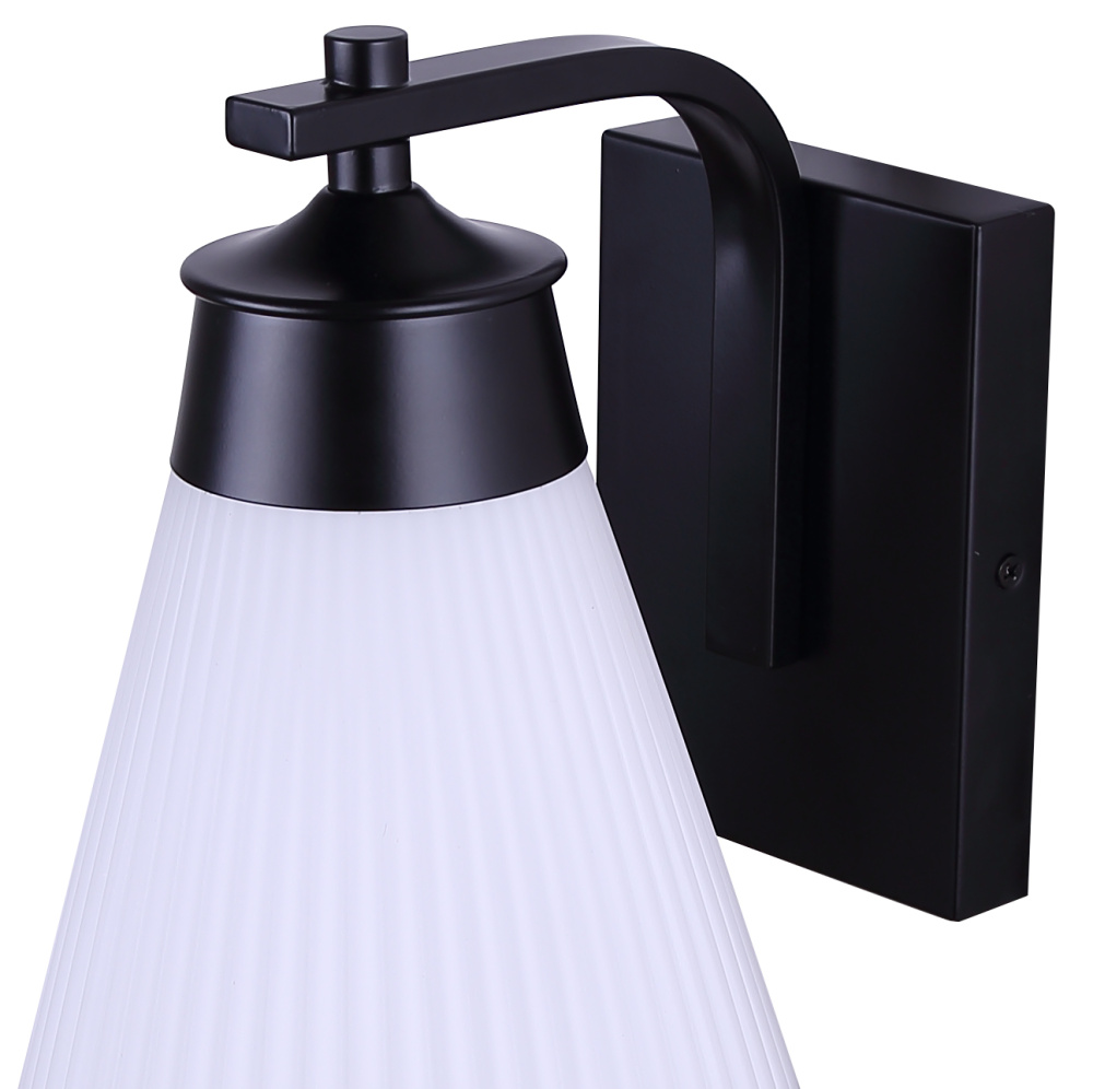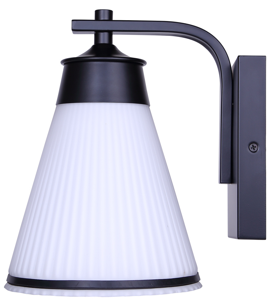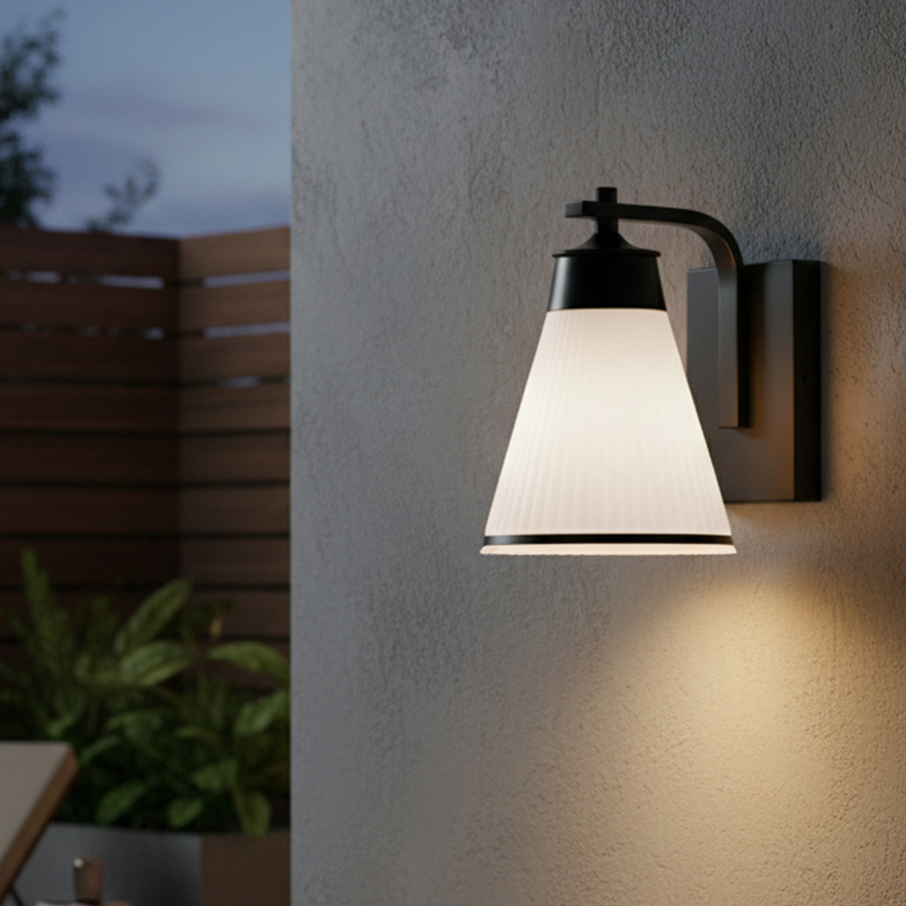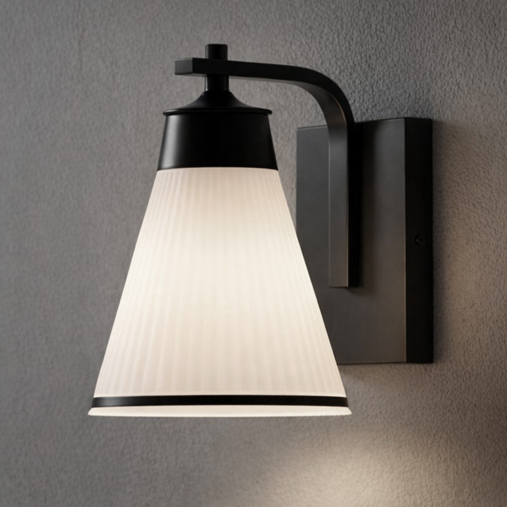 The BOSA outdoor down light combines bold form with contemporary refinement, featuring a matte black frame accented by a cone-shaped ribbed glass shade. Its flat opal finish softens the glow of a single 60W bulb, creating a welcoming ambience while maintaining modern edge. The striking silhouette is accented with a slim black trim piece that frames the glass beautifully. Measuring 6.75 inches wide by 9.75 inches high, this fixture is wet-rated and designed for versatile placement on entryways, patios, or garage exteriors. Built for durability and style, BOSA elevates curb appeal with its distinctive design and reliable outdoor performance.
