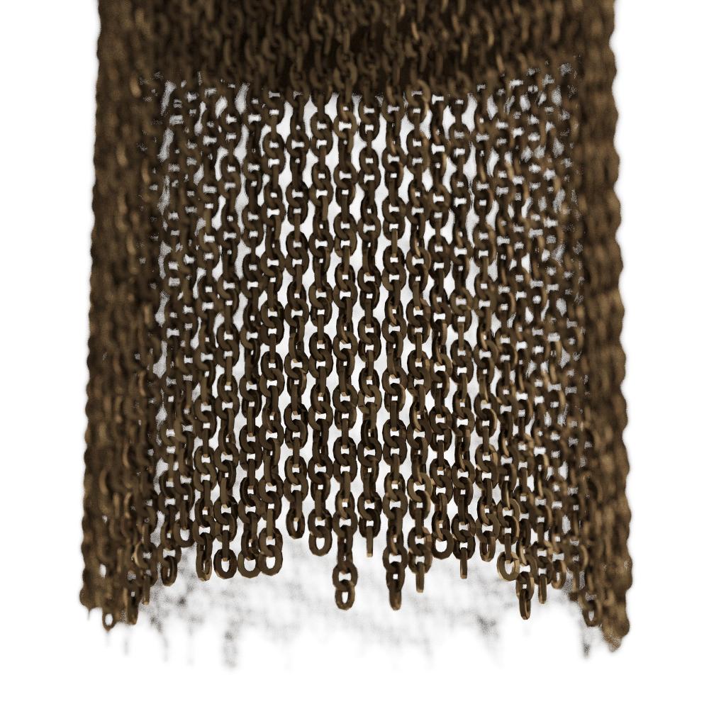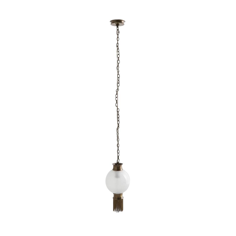 Art Deco lines updated for a modern era result in this chic pendant lamp. Finished with a flourish of antique brass jewelry chain fringe, a frosted glass globe is suspended from a substantial iron chain finished in antiqued brass. Damp-rated, although limited covered outdoor conditions may affect finish. Finish will vary.