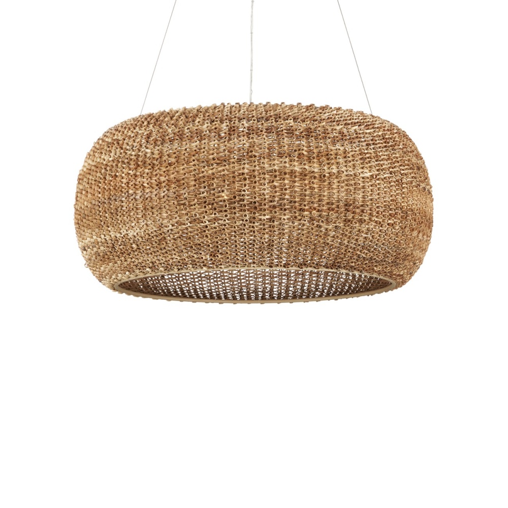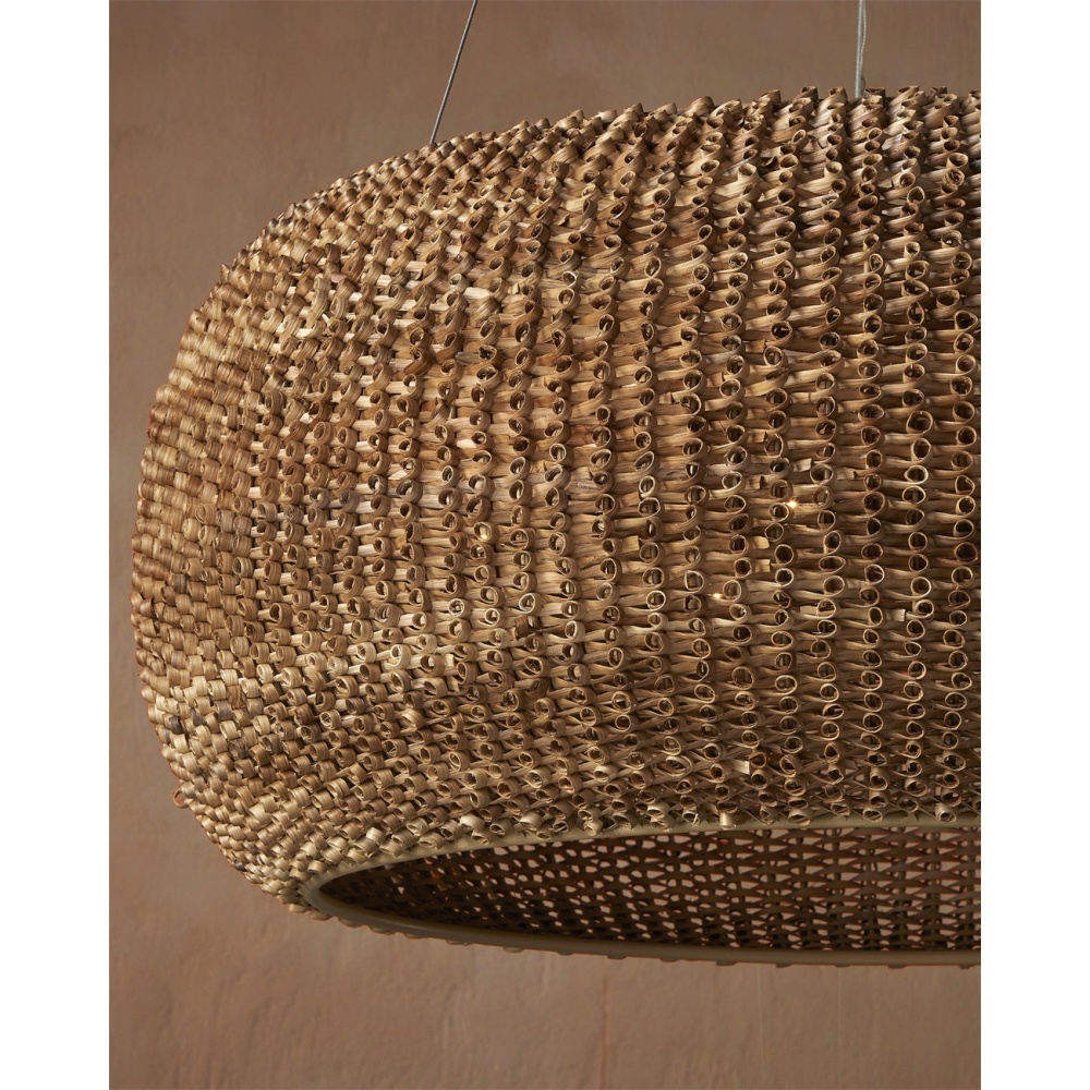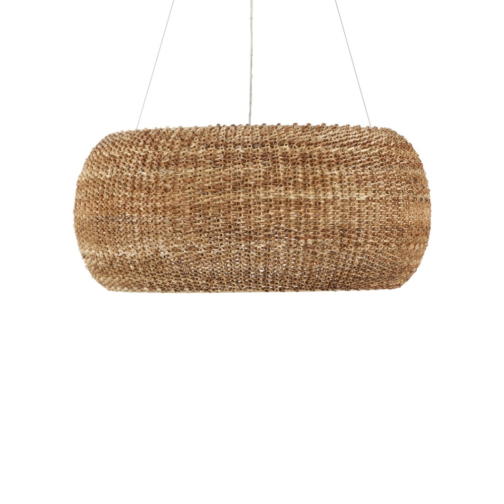 Made from a process that is similar to quilling with paper, the Boucle Chandelier is fashioned from looping natural rattan that has textural curls on the edges. This is a complex weave that is incredibly time-consuming to achieve with the level of consistency that creates a seamless shade. Wrapped around a wrought iron frame in a beige finish, the rattan chandelier will bring great warmth to a space. Adjustable from 36" to 158" with use of included chain/rod kit/cable. If your space calls for a longer drop, additional chain/rods/cable is available for purchase.