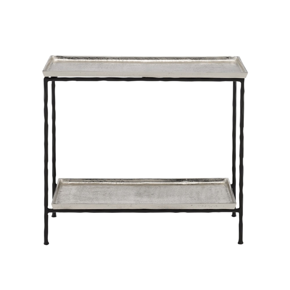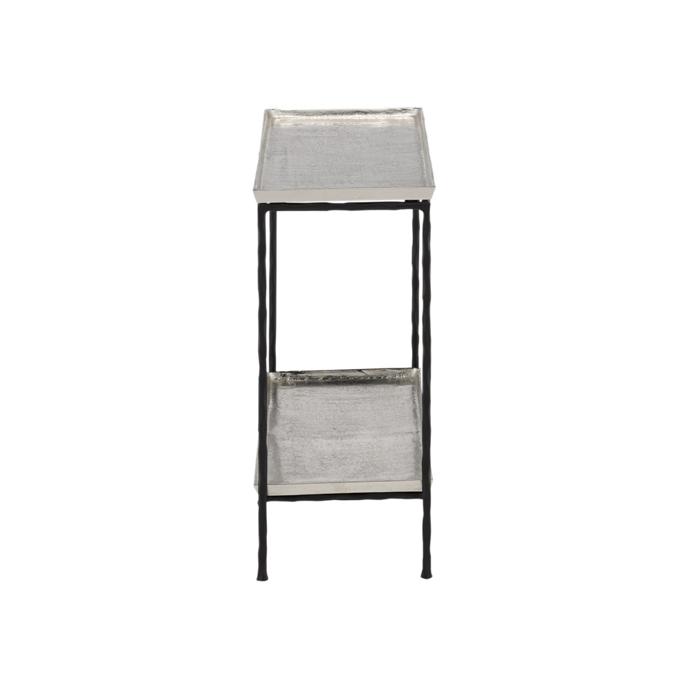 The Boyles Silver Side Table has a profile that is so handsome you may think twice about disturbing its good looks with accessories. The simple iron base that has been treated to a black forged finish proudly lifts its aluminum tray-like top in antique silver, which matches a bottom shelf in finish and shape. This side table is an expressive feature for any spot where a personality-packed table is needed. There are a number of products in an array of finishes in our Boyles offerings.