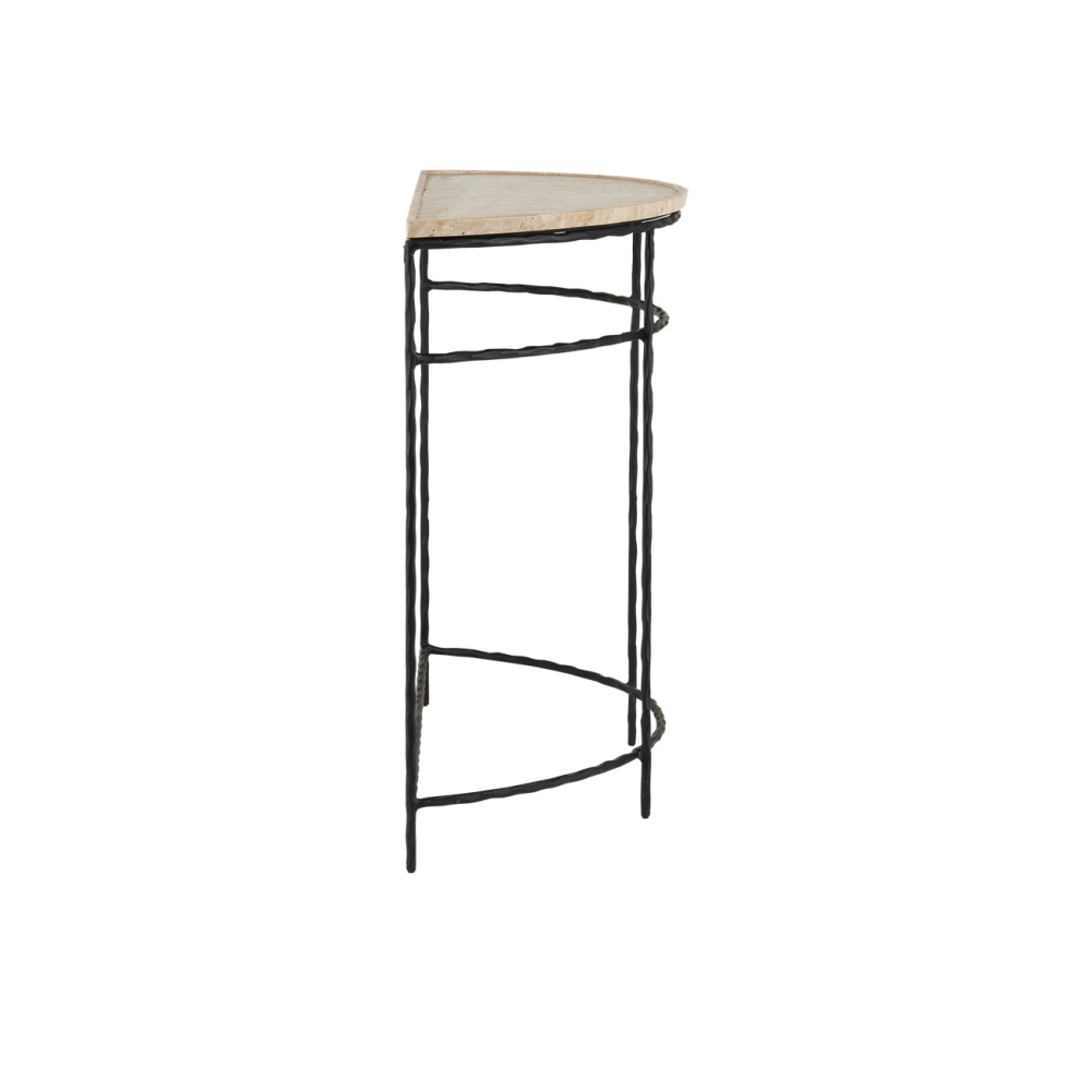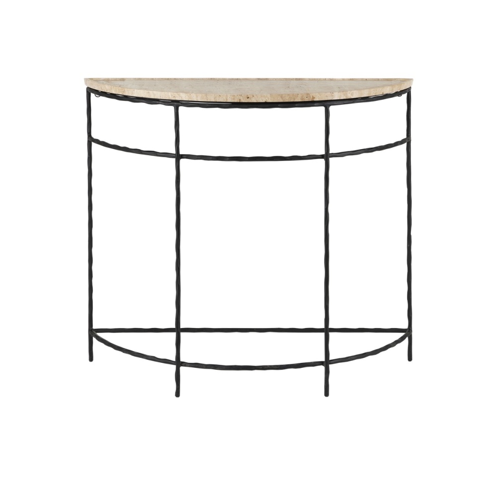 The Boyles Travertine Demi-Lune Table has a forged iron base in a black finish that holds a tray top made of solid, unpolished travertine. The personality of the surface stems from the fact that it is porous and has a variety of nooks and crannies in its pitting. Inherent variations in the stone's texture, veining, and color - from pale ivory to a warm tan - are to be expected and celebrated. Each surface is unique so no two are exactly alike.
