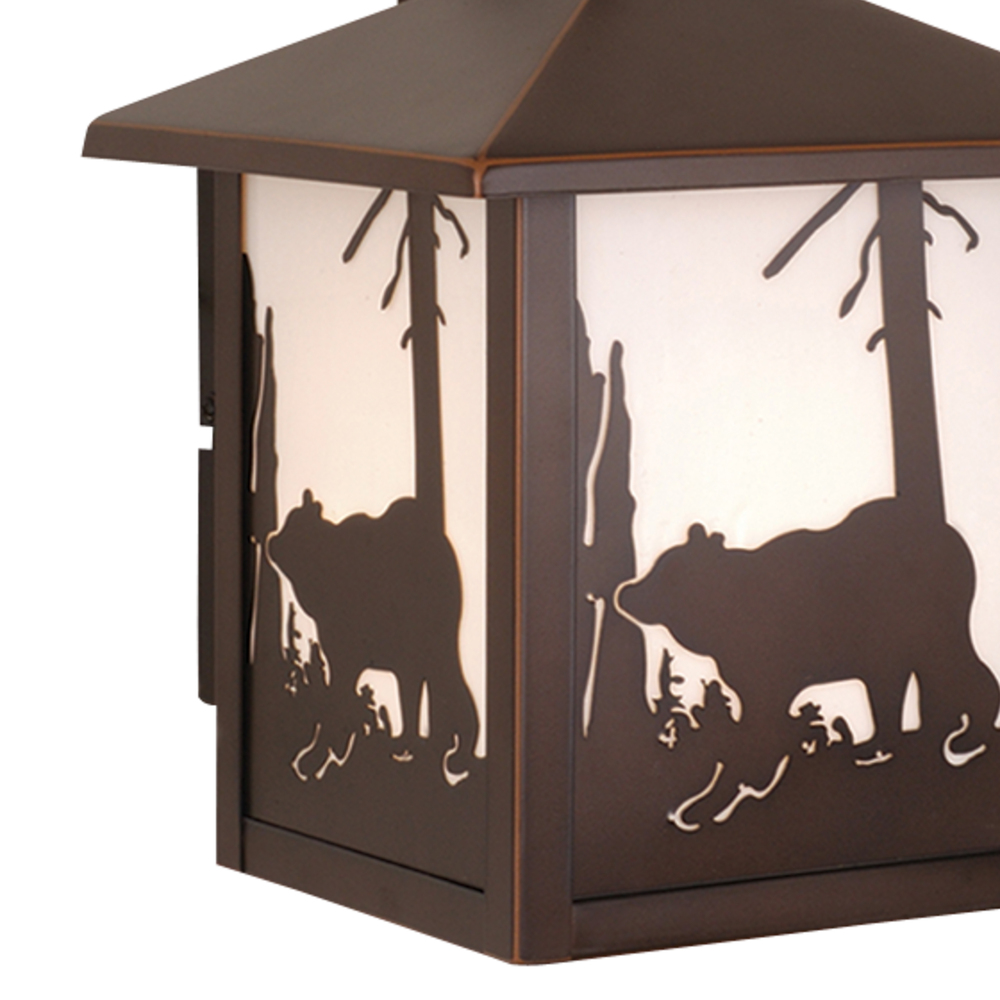 Evoking the spirit of the wilderness, this rustic themed light is clad in a burnished bronze finish and features silhouetted bear imagery atop glowing white tiffany style glass. The classic form of this lamp makes it a great choice for a vacation lodge, cabin or a suburban home - it will complement a variety of home styles: anywhere you want to bring an element of nature. Medium screw base lamping provides maximum light output, and flexibility in bulb choice.