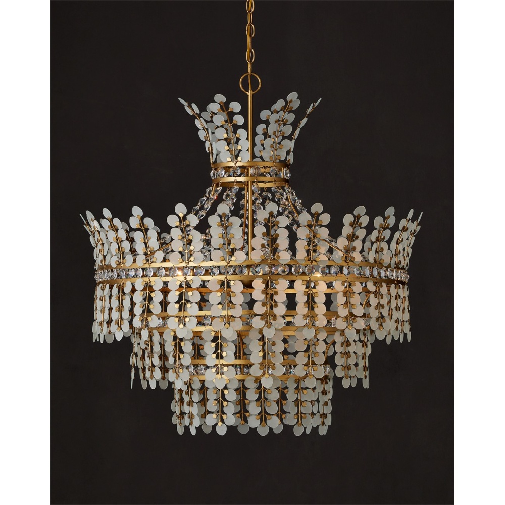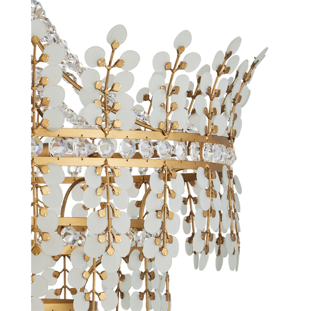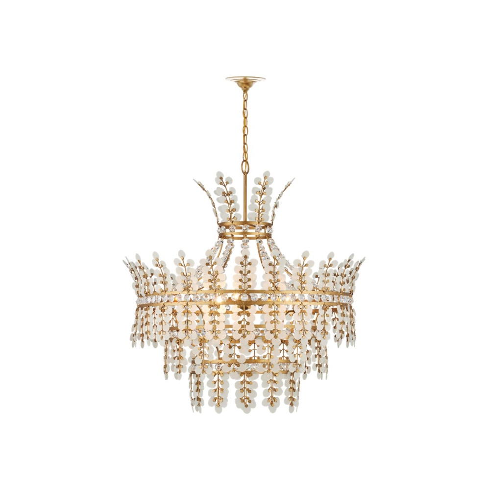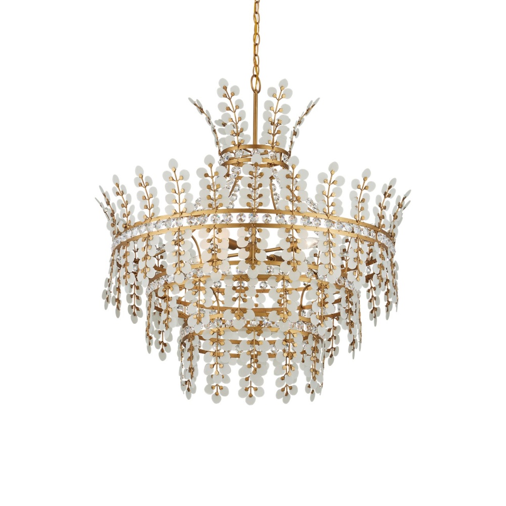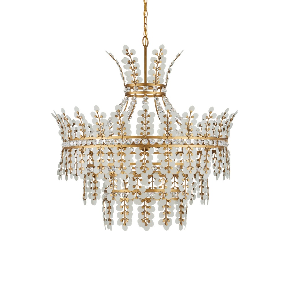 The Bradshaw Chandelier has an elegant classical profile for which its designer, Bunny Williams, is renowned. Made of wrought iron in a warm brass finish, the layered shape has sparkling crystal baguettes in each of the rings and frosted glass discs that flutter up and extend down to create flourishes on the top and bottom, the uppermost curved like coronets. The milky glass pieces, which are made specifically for this fixture individually, have edges that are polished for a sophisticated feel. Each one and each of the crystals are attached by hand. Williams was inspired by an antique with an Art Deco feel when she envisioned this luminous four-light fixture. Adjustable from 44.5" to 112.5" with use of included chain/rod kit/cable. If your space calls for a longer drop, additional chain/rods/cable is available for purchase.