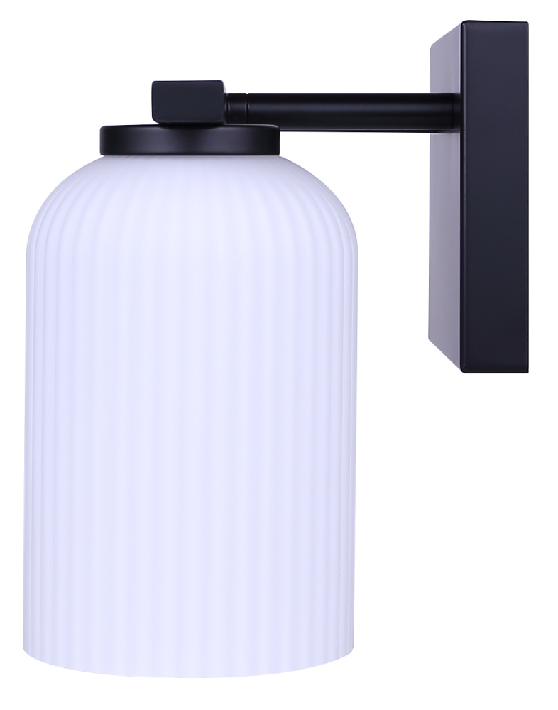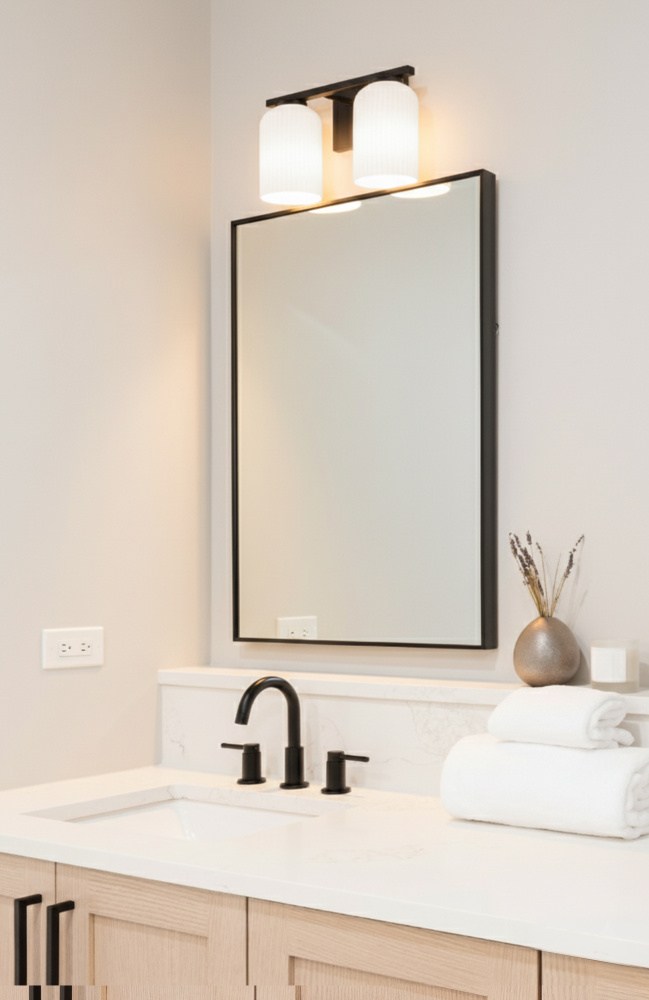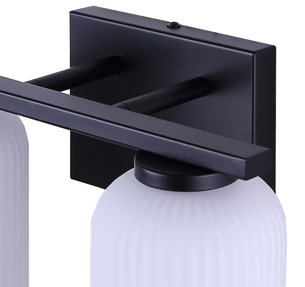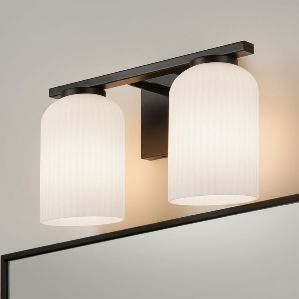 Modern Matte Black Finish: A matte black frame paired with ribbed flat opal glass shades creates a bold yet refined 2-light bathroom vanity wall fixture.