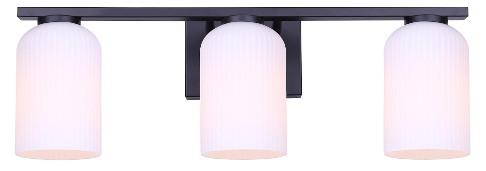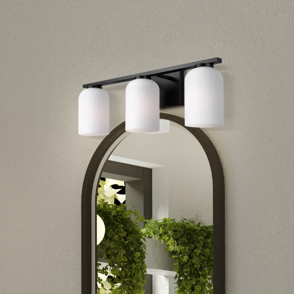 Modern Matte Black Finish: A matte black frame with ribbed flat opal glass shades creates a contemporary 3-light vanity light that is bold yet refined.