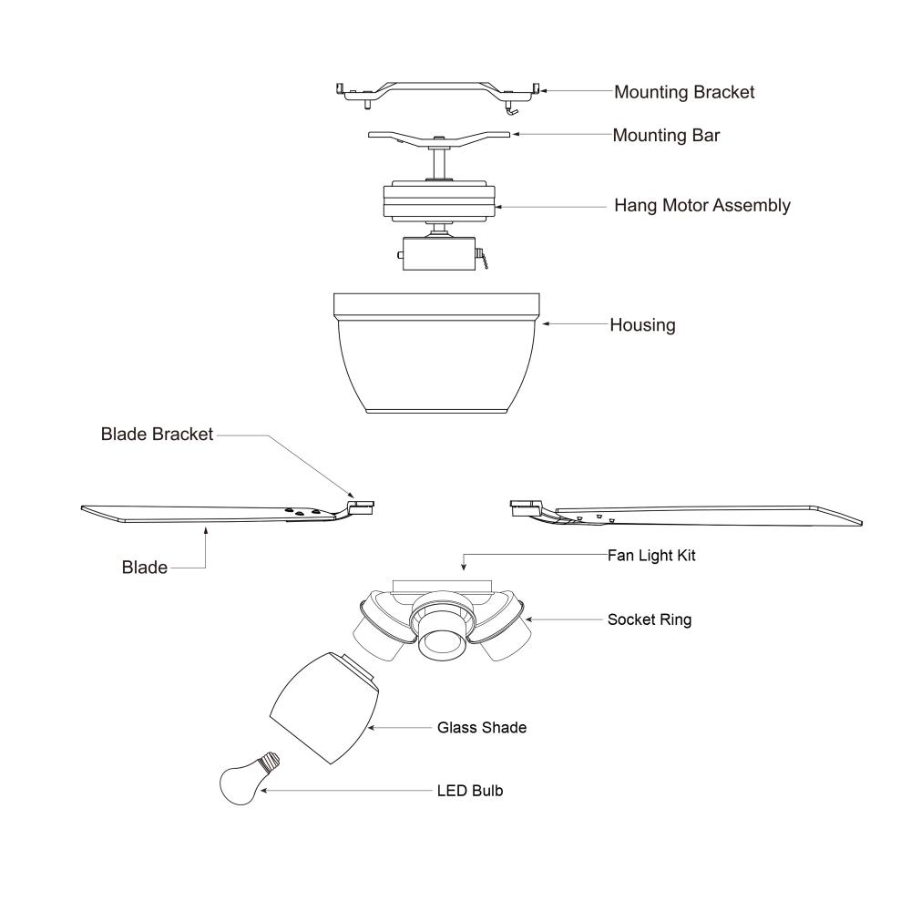 The Brayton ceiling fan in a black finish is transitional styling with a modern look and good value price. The light kit features three distinct clear seeded glass shades and includes clear LED bulbs. Attractive reversible black or dark oak blades allow you to coordinate with any decor. A pull chain makes it easy to control the three speeds. The flush mount motor housing is ideal for low ceilings and standard height rooms. This fan is perfect for your living room, bedroom, kitchen, or home office. Can be alternatively installed without the light kit.