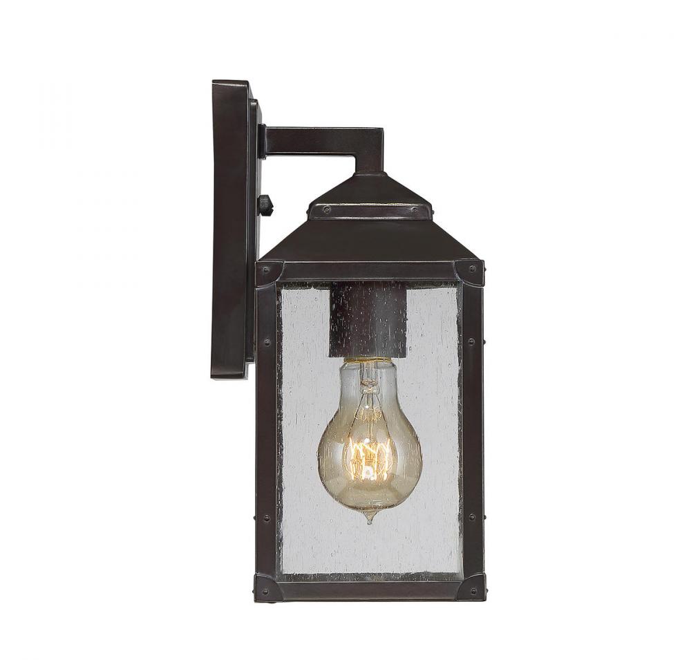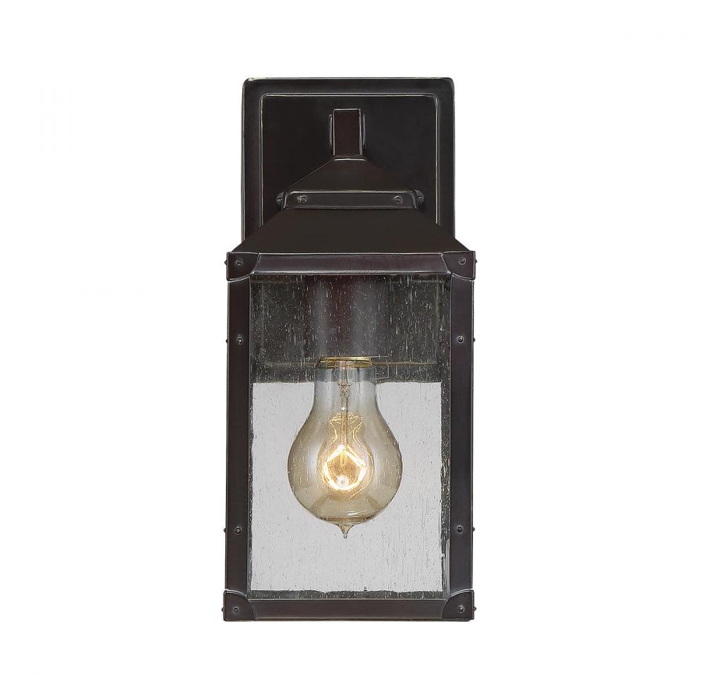 Simple, streamlined, and stylish, the Savoy House Brennan 1-light outdoor wall lantern is the perfect fixture to light the outdoor areas of your home. The frame, wall plate and socket cover have a classic, dark English bronze finish with gold accents. The clean lines of the rectangular frame have an uncluttered silhouette that showcases the beautiful panels of clear, seeded glass. One downward-facing 60W standard size bulb provides terrific illumination, welcoming you and your guests. This lantern is 5" wide by 11.25" high and rated for wet locations, so it’s an ideal fixture to bring light and timeless style to your porch, patio, sunroom, pergola and other outdoor living areas.