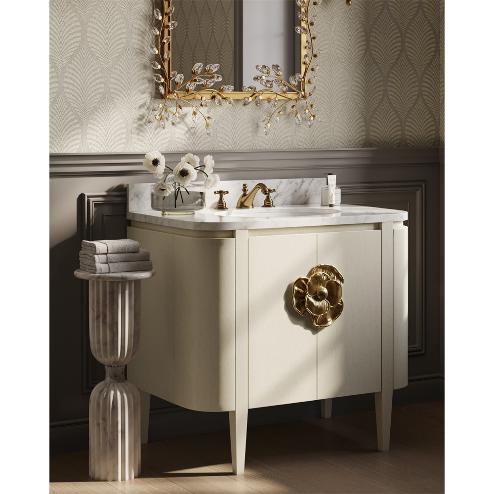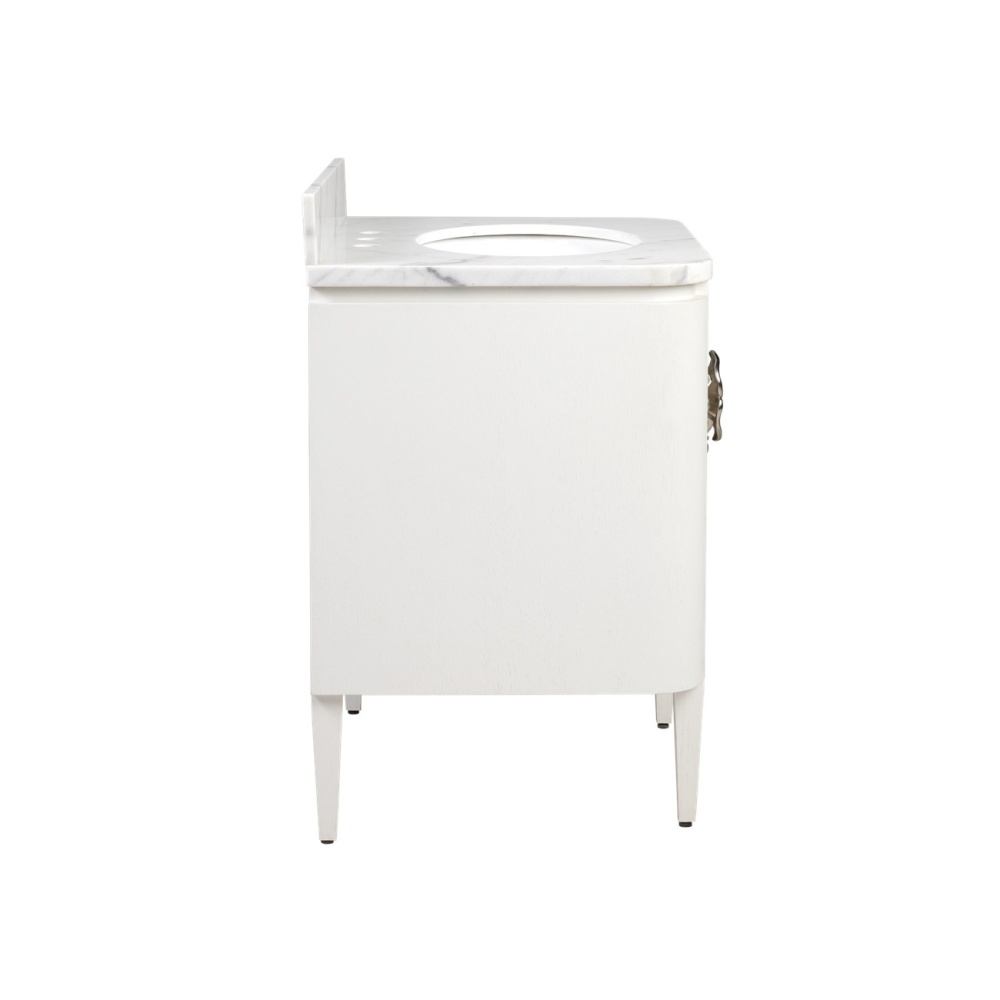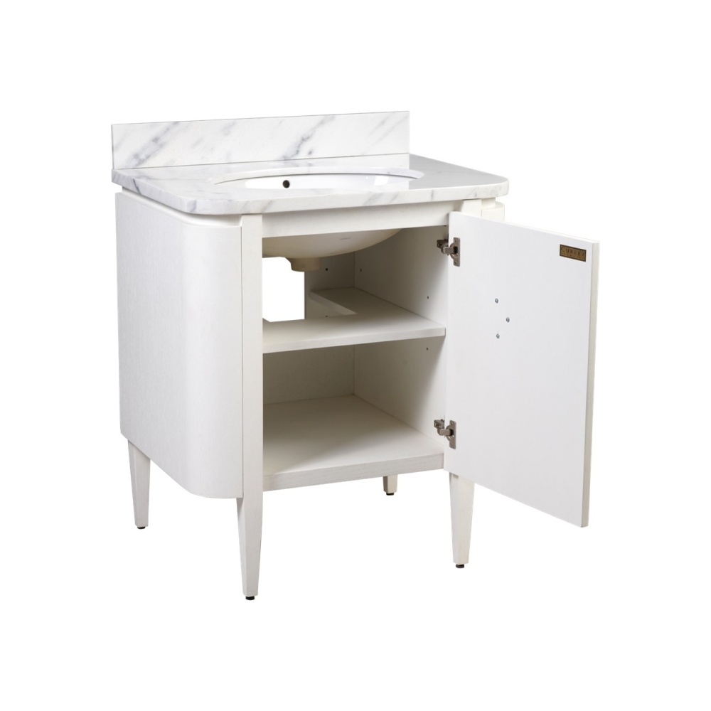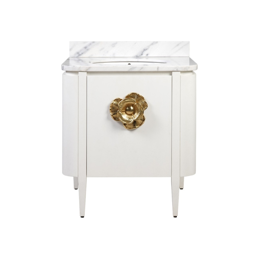 The impressively sized brass flower pull on the Briallen 30" White Vanity is a stunning ornamentation that contrasts the cerused white finish. The interior has one adjustable shelf and there is an optional wood tray that attaches to the inside of the door. The white Carrara marble top is fitted with a white oval undermount sink. Other fine design attributes include soft-close door hinges and a matching marble backsplash.
