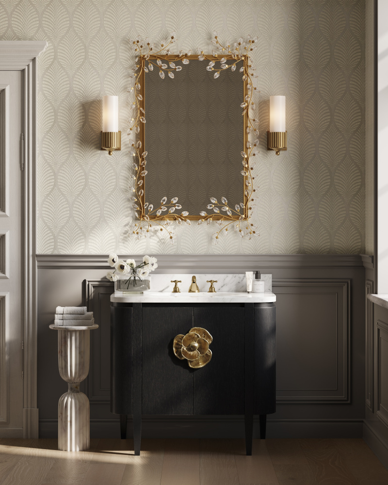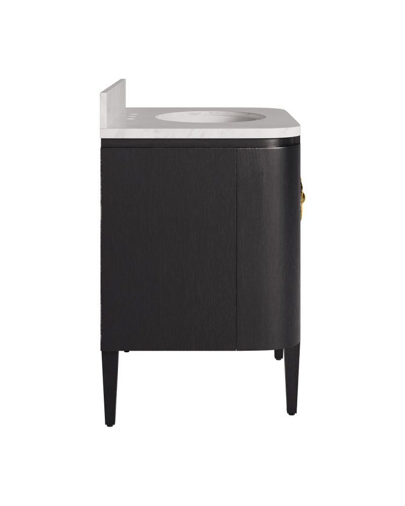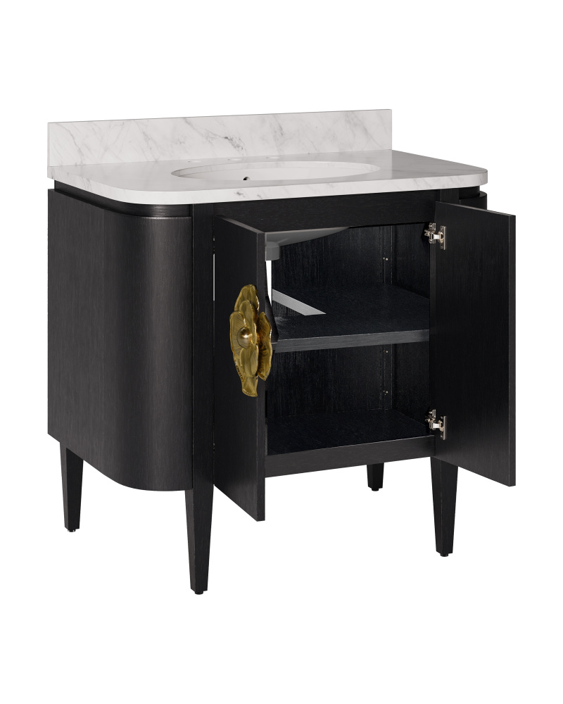 The Briallen 36” Black Bath Vanity is a striking design with thoughtful details. Finished in a Caviar black, it has a statement-making feature in the brass flower pull in light antique brass that adorns the door. Inside, a single adjustable shelf and two optional wood trays that attach to the door provide flexible storage solutions. A Carrara marble top holds an oval undermount sink.