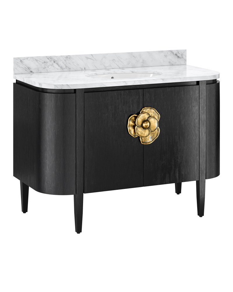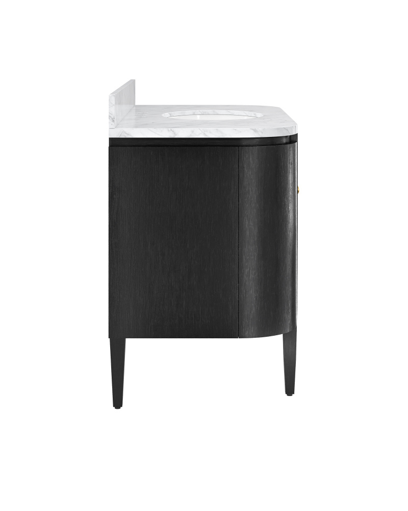 The Briallen 48" Black Vanity with Undermount Sink brings an elegant and sophisticated vibe to a designer bathroom or powder room. This new freestanding vanity, inspired by our longtime best-selling cabinet, is made of white oak solids and veneers, with a white Carrara marble top and backsplash, and our signature cast brass door pull. The pre-installed oval porcelain sink is by TOTO.