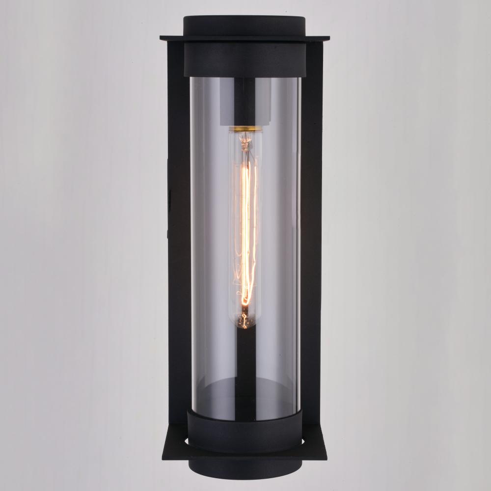 A long slim tube accentuates the grace and class shown in the Brighton Park collection. A striking textured black metal frame supports and suspends the clear glass cylinder showcasing a generous display of light. This linear outdoor lighting collection is a clean accent suited for any contemporary space. Add this wall mount sconce light to any entryway, garage, or patio for that stylish touch.